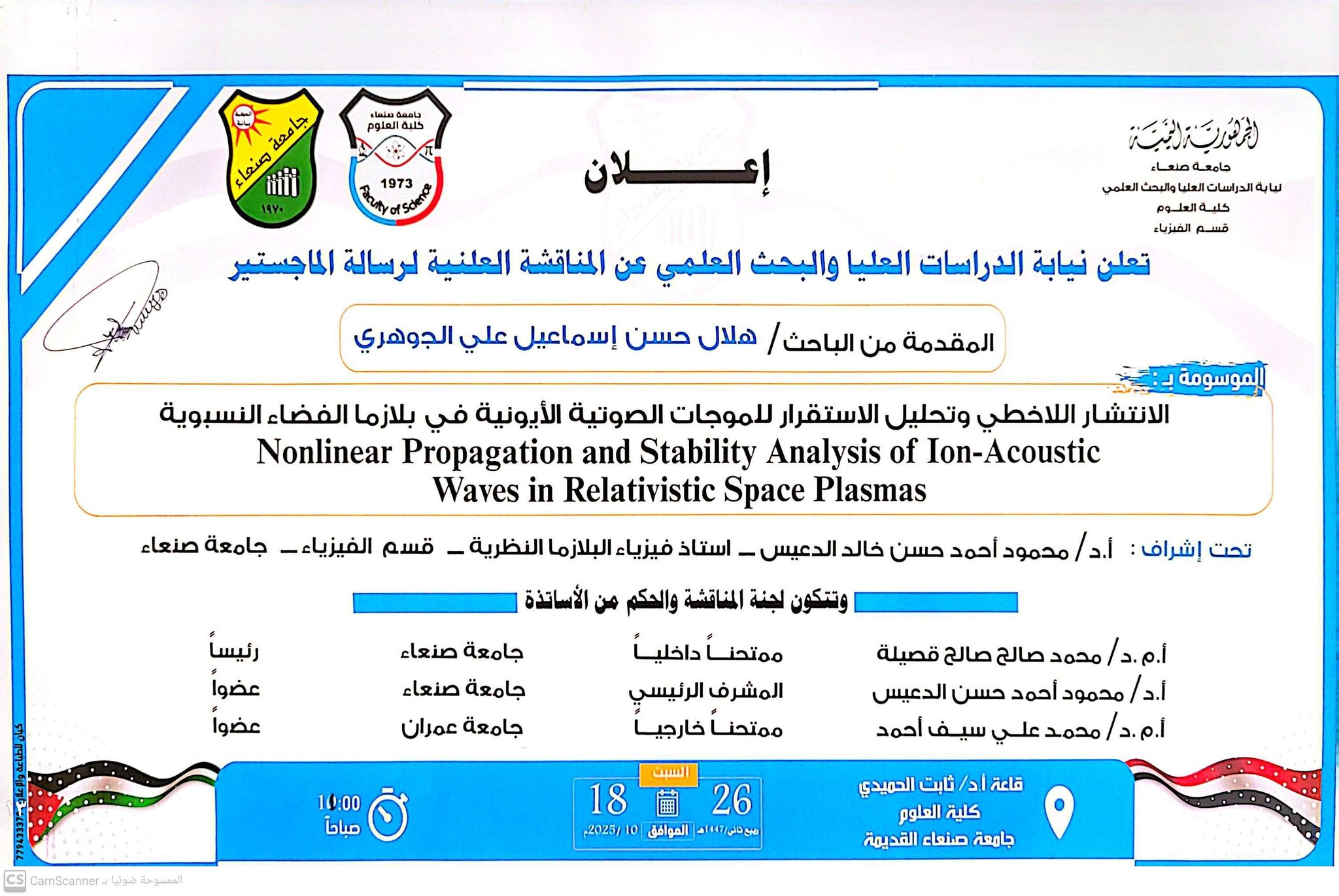 “إعلان هام” تعلن عمادة #كلية_العلوم عن وذلك يوم السبت 1 نوفمبر 2025م نتمنى للجميع التوفيق والنجاح في الفصل الدراسي الجديد. لمزيد من المعلومات، يرجى زيارة موقع الكلية الإلكتروني https://su.edu.ye/coss/ الهاتف 781035863 #جامعة_صنعاء_جامعة_اليمن_الأولى #جامعة_صنعاء_أول_جامعة_حكومية_في_اليمن #جامعة_صنعاء_أول_جامعة_في_اليمن