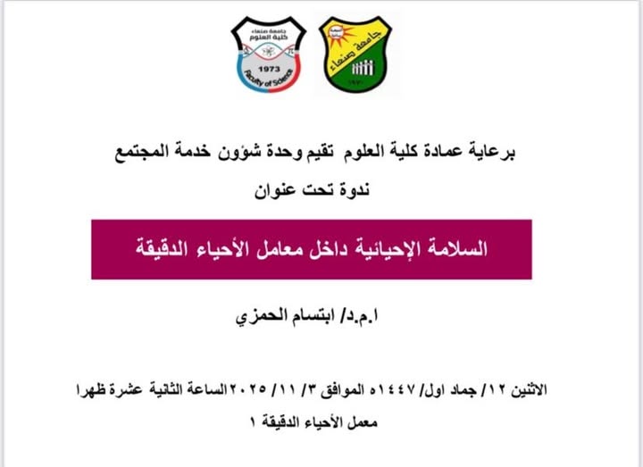 صنعاء – 3 نوفمبر 2025م أقامت وحدة شؤون خدمة المجتمع أمس الإثنين ندوة بعنوان «السلامة الإحيائية داخل معامل الأحياء الدقيقة»، قدّمتها الدكتورة ابتسام الحمزي. هدفت الندوة إلى تعزيز الوعي بأهمية الصحة والسلامة داخل المعامل، مؤكدةً أن السلامة ليست مجرد إجراء …