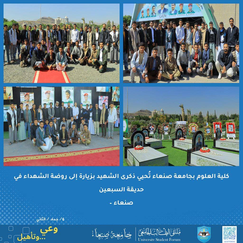 صنعاء – في أجواء مهيبة غمرتها مشاعر الفخر والإجلال، نظّمت كلية العلوم بجامعة صنعاء زيارة ميدانية إلى روضة الشهداء في ميدان السبعين بالعاصمة صنعاء، ضمن فعاليات إحياء أسبوع الشهيد، وبمشاركة عدد كبير من الطلاب . بدأت الزيارة بقراءة الفاتحة على …
