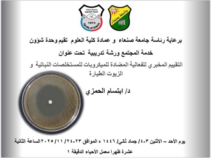 نظّمت وحدة شؤون خدمة المجتمع بكلية العلوم – جامعة صنعاء، خلال يومي الأحد والإثنين 3–4 جمادى الآخرة 1447هـ، الموافق 23–24 نوفمبر 2025م، ورشة تدريبية علمية بعنوان: “التقييم المخبري للفعالية المضادة للميكروبات للمستخلصات النباتية والزيوت الطيّارة”، وذلك بإشراف الدكتورة ابتسام الحمزي، …
