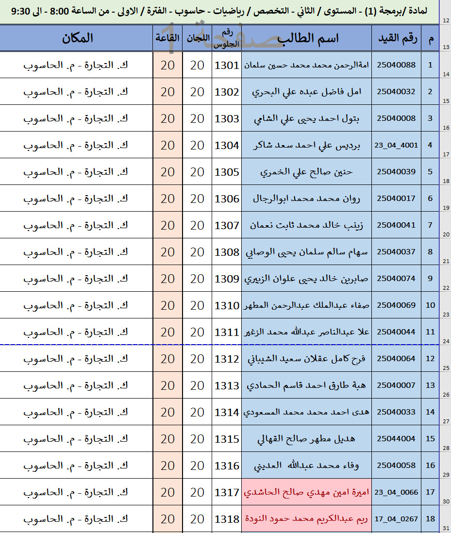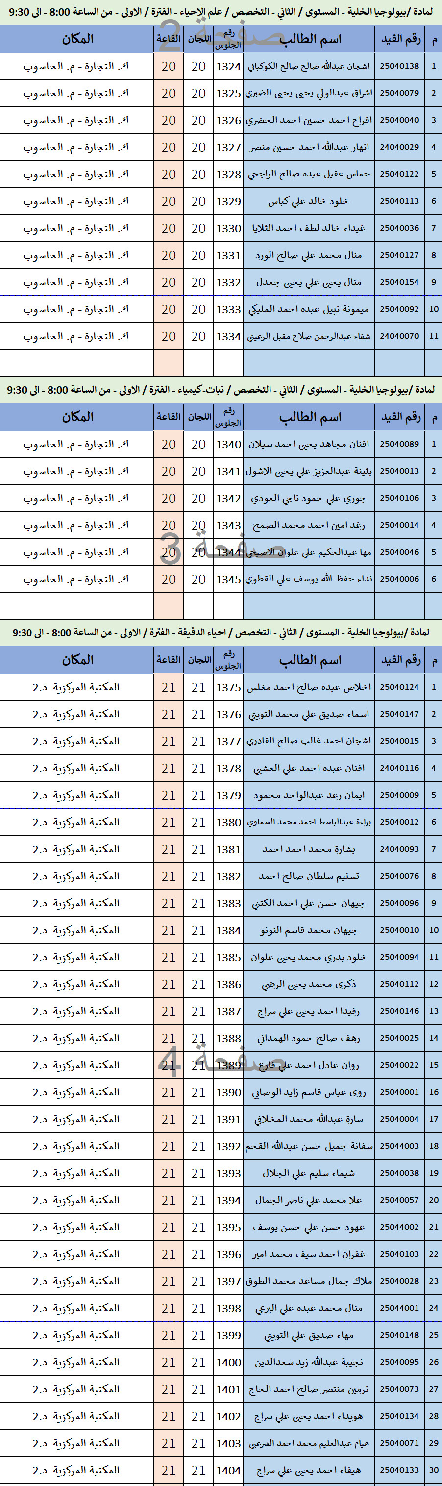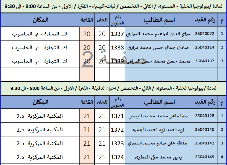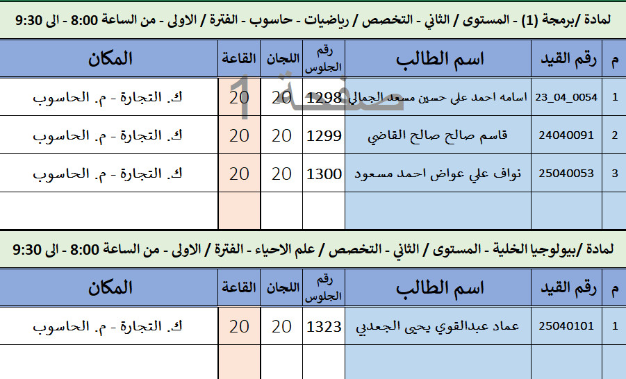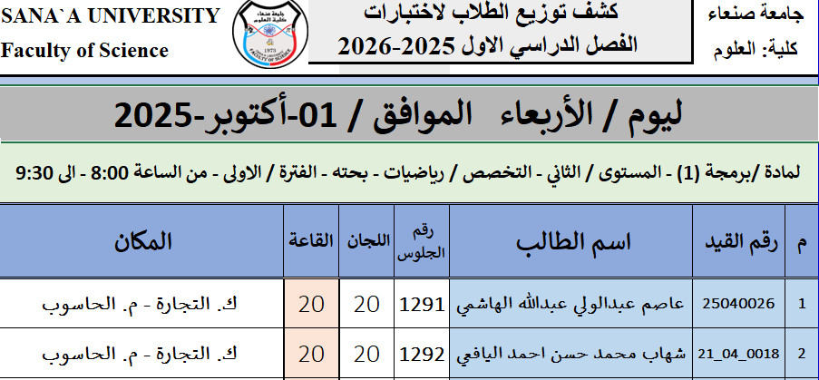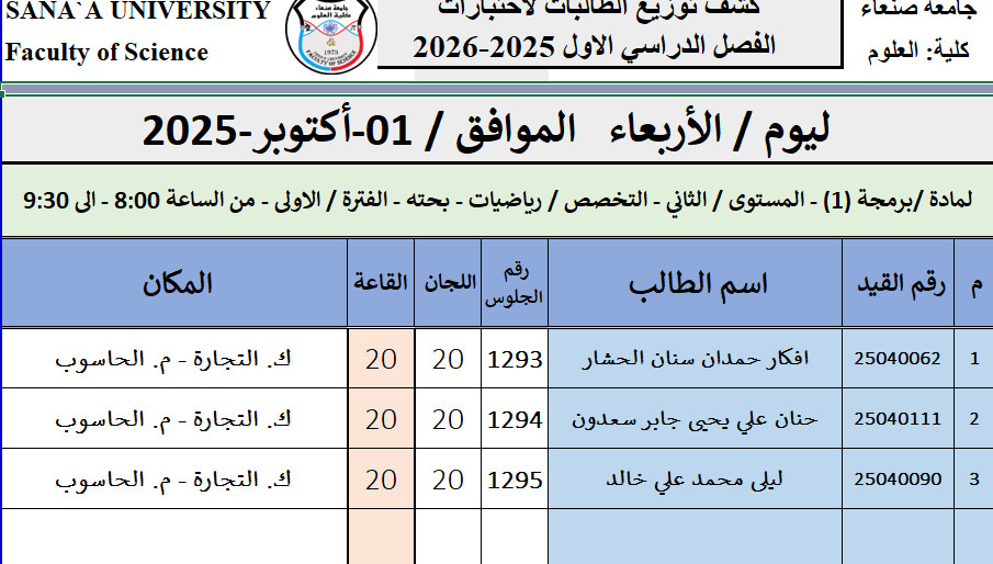 كشف توزيع الطلاب لاختبارات الفصل الدراسي الاول 2025-2026 ليوم / الأربعاء الموافق / 01-أكتوبر-2025