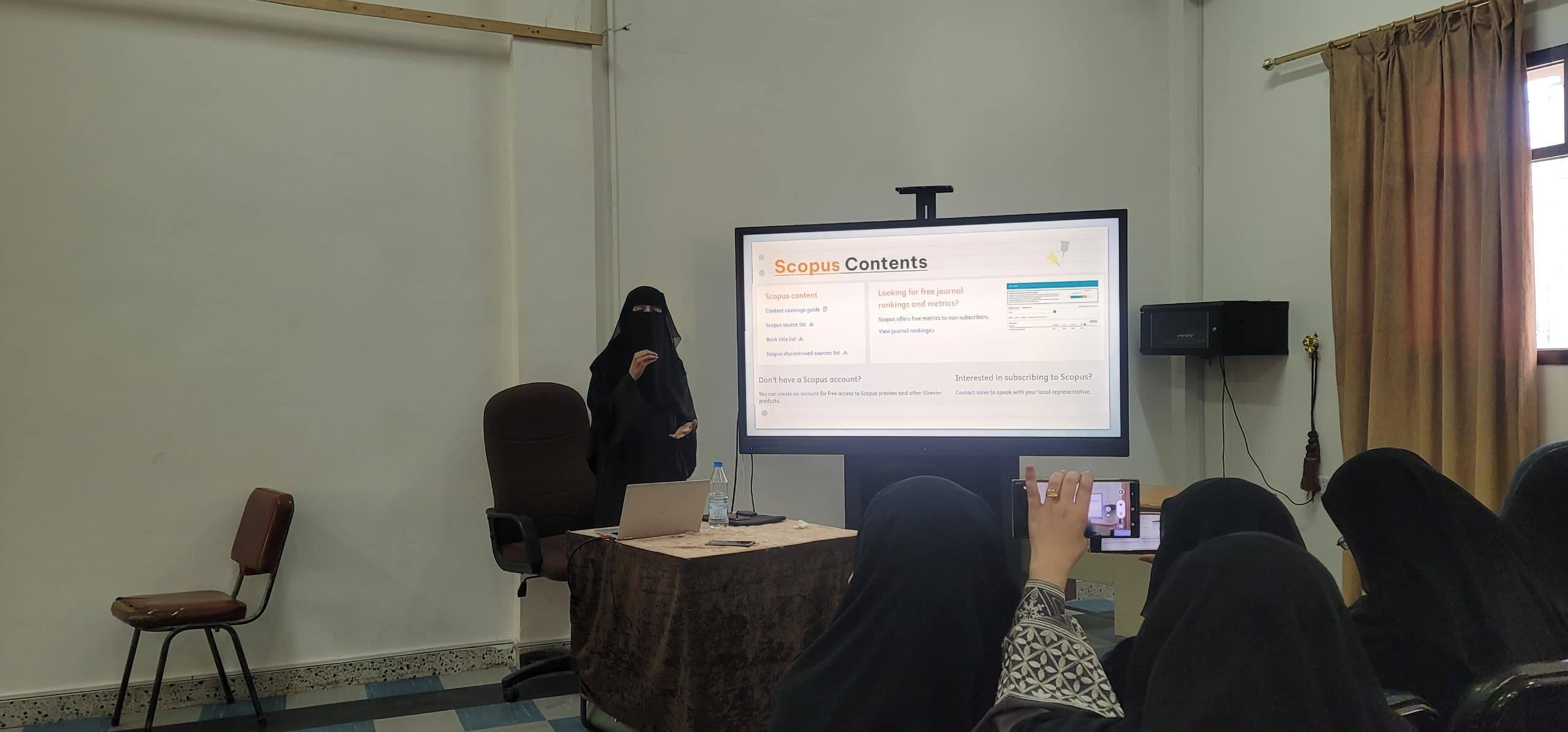 Under the auspices of the Dean of the College of Science, Dr. Muhammad Qasila, the Community Service Unit held this Saturday 25/ Rajab/ 1446 corresponding to 1/25/2025 training workshops entitled: Academic publishing in the magazines classified in Scopes: steps and strategies. In the hall of the late /Thabet Al -Hamidi, which was delivered by Dr. Amira Ali Al -Harthi