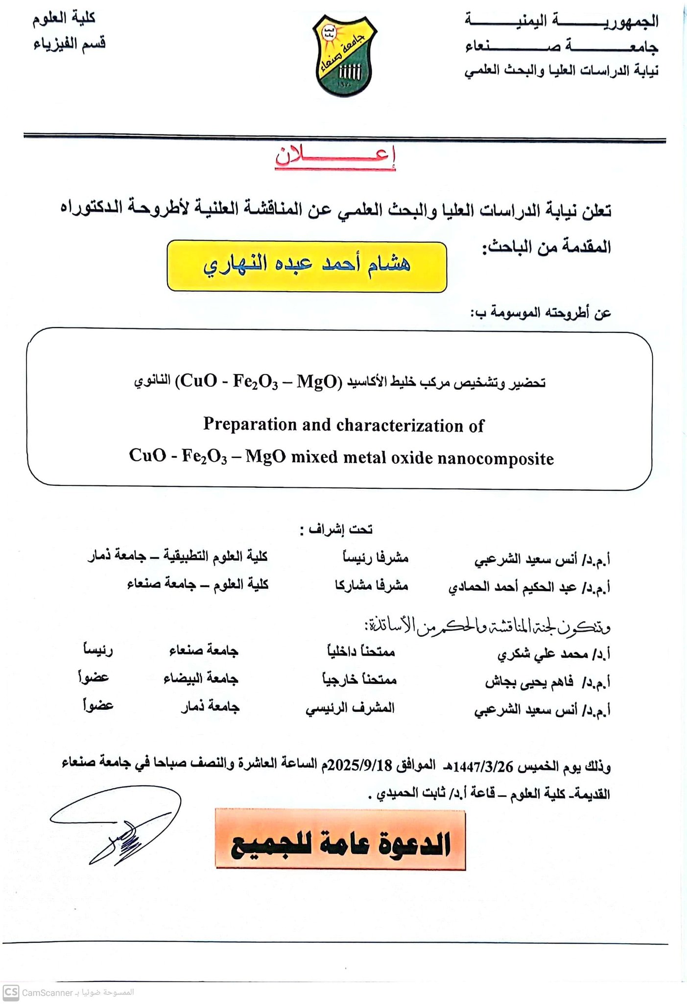 Announcement of the public discussion of the doctoral thesis of the researcher Hisham Al-Nahari