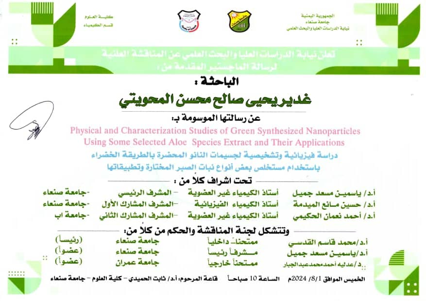 Researcher Ghadeer Yahya Saleh Mohsen Al-Mahwiti obtained a master’s degree with excellent grade in the Department of Life Sciences, specializing in Physical Chemistry, College of Science, Sana’a University, for his thesis titled