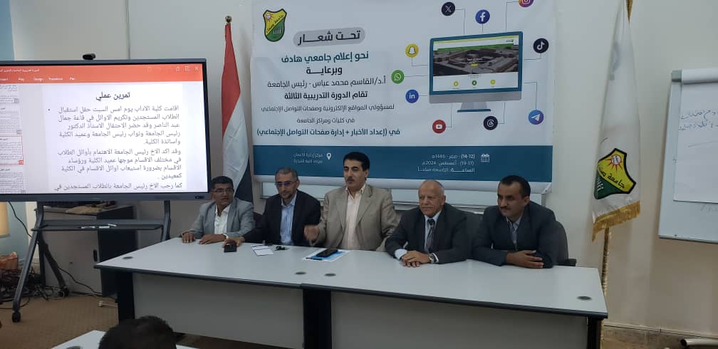 During the conclusion of the three-day course, which was held at the Business Administration Center of the Faculty of Commerce, Mr. Adel Al-Hababi, the University Rector’s Advisor for Media Affairs, explained that the main goal of organizing this course was to equip the forty participants—responsible for the websites and social media platforms of the university’s faculties and centers—with the appropriate skills to effectively cover news, events, and activities taking place within their faculties and centers at Sana’a University. The university is the first in Yemen, with a robust infrastructure and a wealth of human resources, represented by its esteemed teaching staff across all faculties and centers. It serves tens of thousands of students from various Yemeni governorates in nearly every field of science.