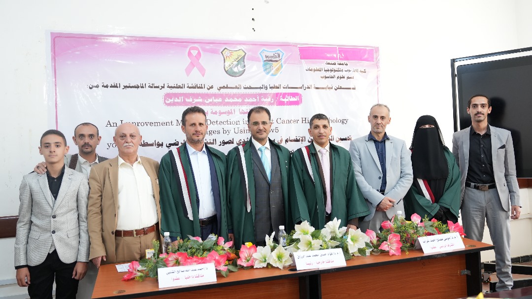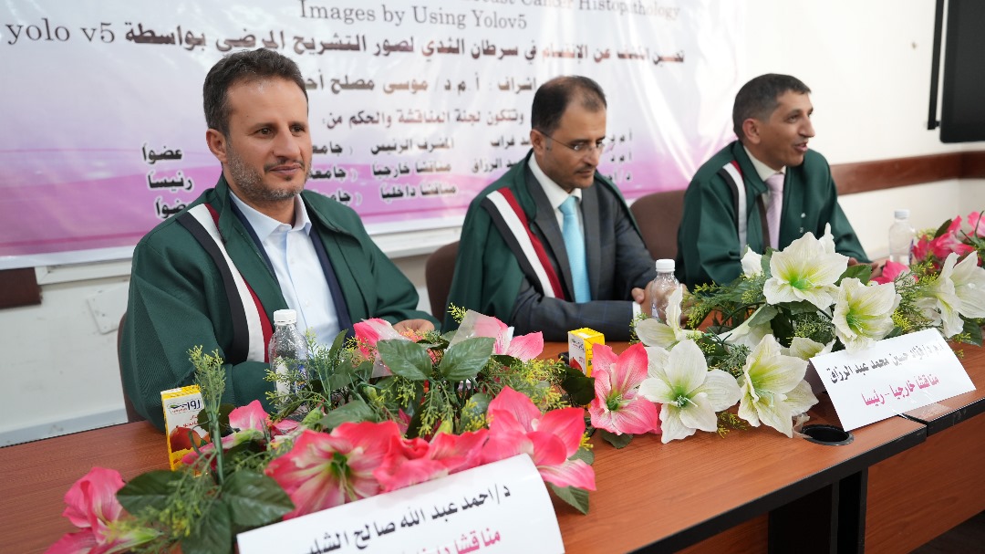The student Ruqayyah Ahmed Muhammad Ali Abbas Sharaf Al-Din obtained a master’s degree with a score of 95% and an “excellent” grade in the Department of (Computer Science), specializing in (Computer Science), College of (Computer and Information Technology) at Sana’a University, for her thesis entitled (“An Improvement Mitosis Detection in Breast Cancer Histopathology Images by Using Yolov5”) on Tuesday, Hijri date 04/03/1446 corresponding to 07/09/2024 AD.