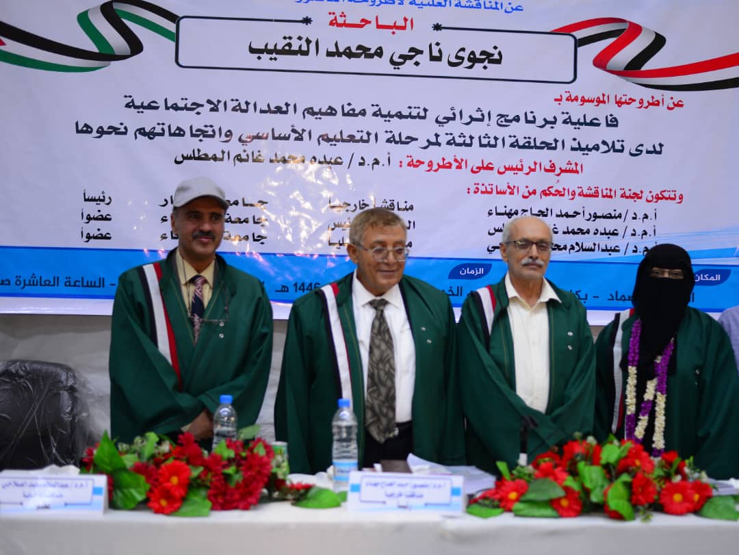 The Public Viva-Voice Examination for the PhD Dissertation hereto entitled: “The Effectiveness of an Enrichment Program on Developing Social Justice Concepts Among the Third Study Cycle Students of Primary Education and Their Attitudes towards it”, submitted by Ms. Najwa Naji Mohammed Alnaqeeb Department of Social Sciences (Curricula and Methods of Teaching Social Sciences) , Faculty of Education –Sana’a, was held on Thursday, 16/03/1446 Hijri corresponding to 19/9/2024. The Viva-Voce Committee, which was formed based on a resolution issued by the Post-Graduate Studies and Scientific Research Council, consisted of the following: