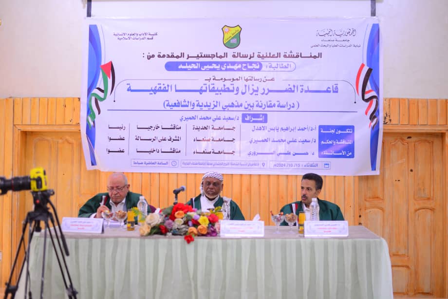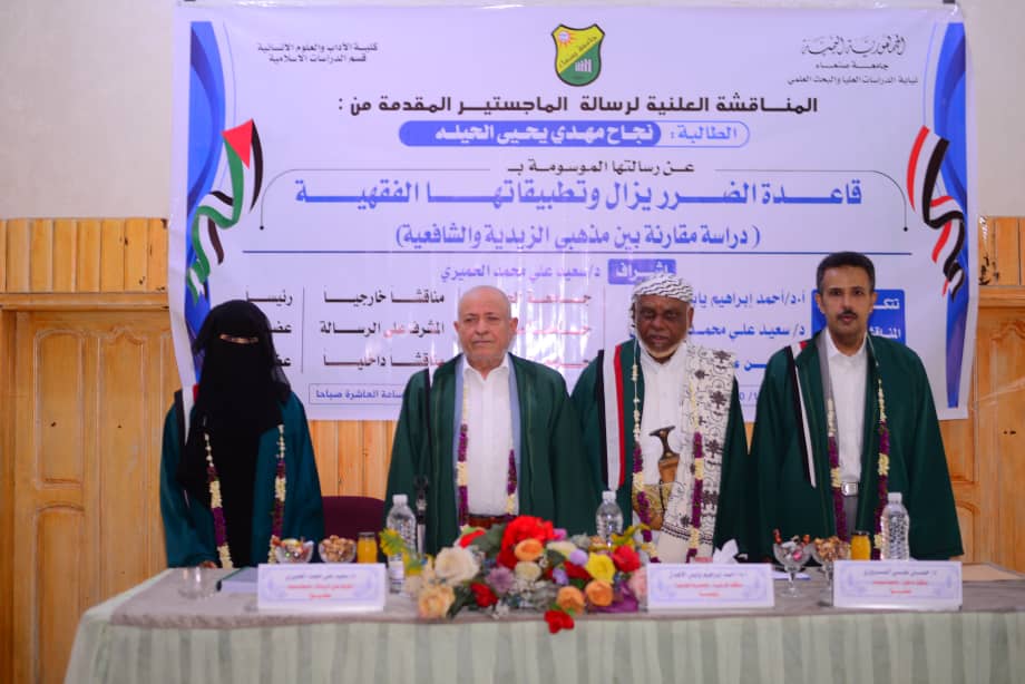 Ms. Najah Mahdi Yahya Al-Hila successfully obtained MA degree in Islamic Studies, majoring in Comparative Jurisprudence, from the Faculty of Arts & Humanities at Sana’a University. She achieved a commendable grade of 95, classified as excellent, for her thesis entitled “The Rule of Removing Harm and Its Jurisprudential Applications: A Comparative Study Between the Zaydi and Shafi Schools”.
