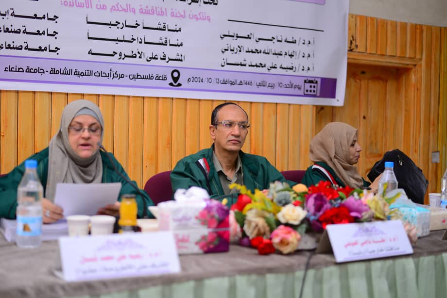 Ms. Najla Ahmed Abdullah Abdul Rahman Al-Azizi successfully obtained her PhD majoring in Clinical Psychology (Psychotherapy) from the Department of Psychology at the Faculty of Arts & Humanities, Sana’a University. Her dissertation entitled: “The Effectiveness of the Meaning Therapy (Logotherapy) Program in Reducing Adjustment Disorder Among Displaced Yemeni Women,” was defended on Sunday, Rabi’ al-Thani 1446 Hijri, corresponding to October 13, 2024.