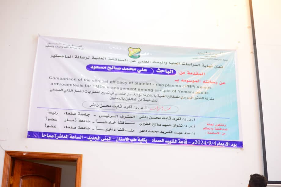 Wednesday Rabii-Awal 1st, 1446H, September 4th, 2024, the candidate researcher/ Ali Mohammed Saleh MASOUD obtained the Master degree in Oral and Maxillofacial Surgery with an Excellent average, Major: Oral and Maxillofacial Surgery from Faculty of dentistry, Sanaa University, for his Master thesis entitled: Comparison Of The Clinical Efficacy Of Platelet-Rich Plasma (PRP) Versus Arthrocentesis For TMDs Among A Sample Of Yemeni Adults. The discussing committee was formed of: Professor Dr. Akram Thabet Mohsen NASHER, Principle Supervisor and Committee Member, Professor Dr. Sam Abdel-Karim DAER, Internal Examiner and Head of Committee, and Associate Professor Nashwan Hamid AL-TAIRY, External Examiner and Committee Member. The dissertation aims at determining and evaluating the clinical effects of PRP in comparison to TMJ arthrocentesis for the management of TMDs.