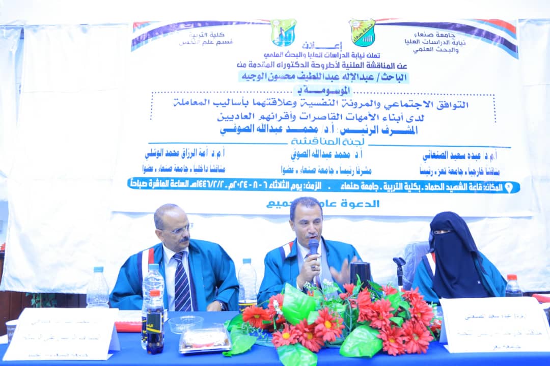 Mr. Majed Aslan: The Public Viva-Voice Examination for the PhD Dissertation hereto entitled: “Social Compatibility and psychological flexibility and their Relationship with the Treatment Means among Children of Underage mothers and their ordinary peers”, submitted by Mr. Abdulelah Abdulatif Mahsoun Alwajeeh Department of Educational Psychology, Faculty of Education –Sana’a, was held on Tuesday, 30/01/1446 Hijri corresponding to 6/8/2024. The Viva-Voce Committee, which was formed based on a resolution issued by the Post-Graduate Studies and Scientific Research Council, consisted of the following: