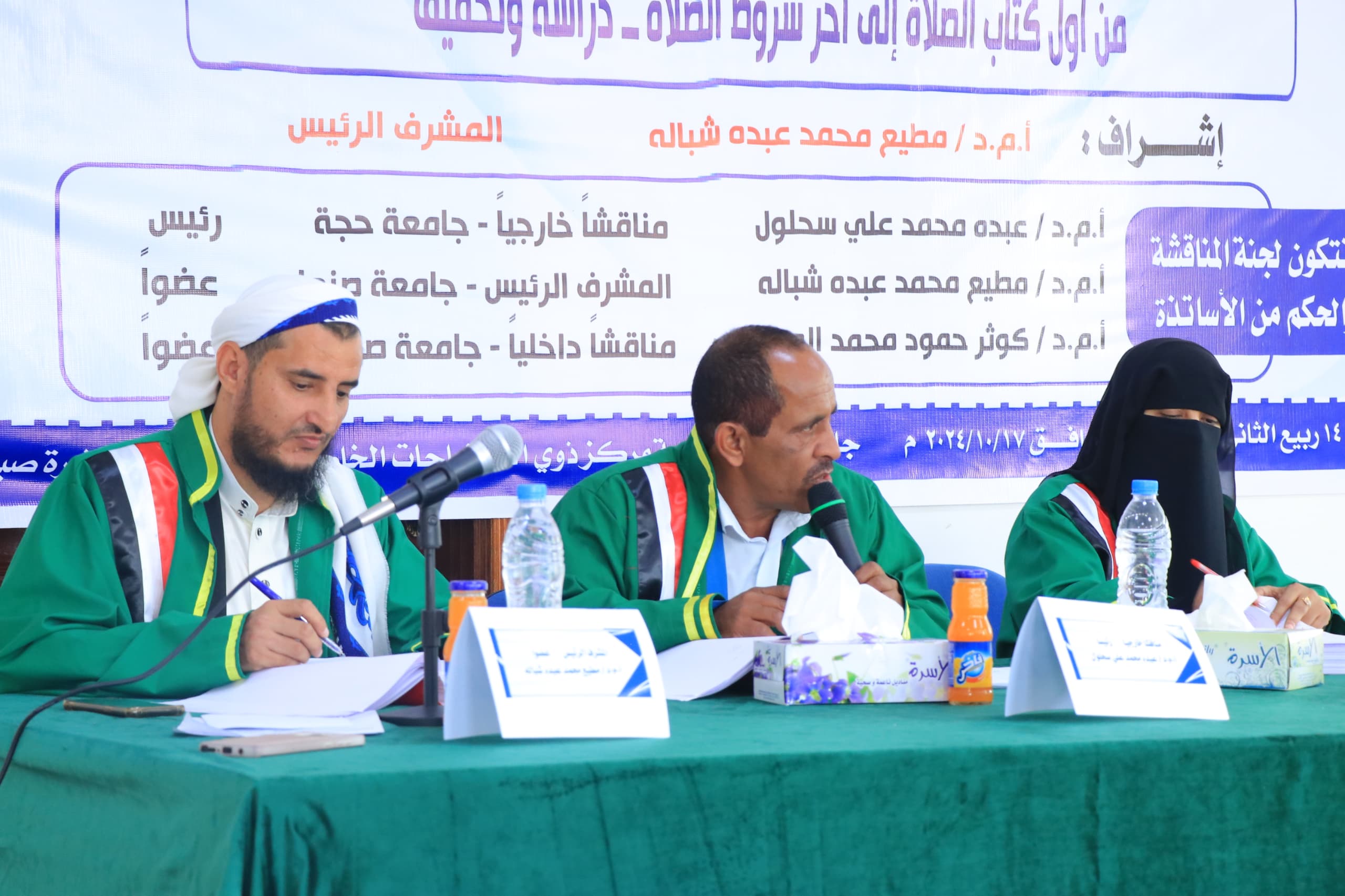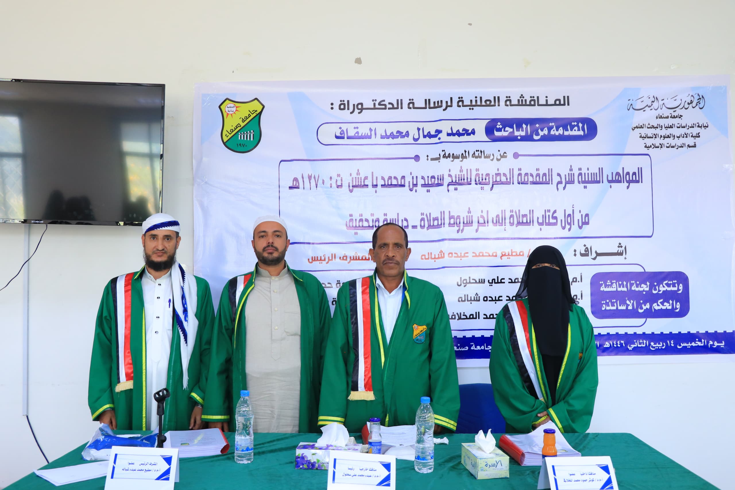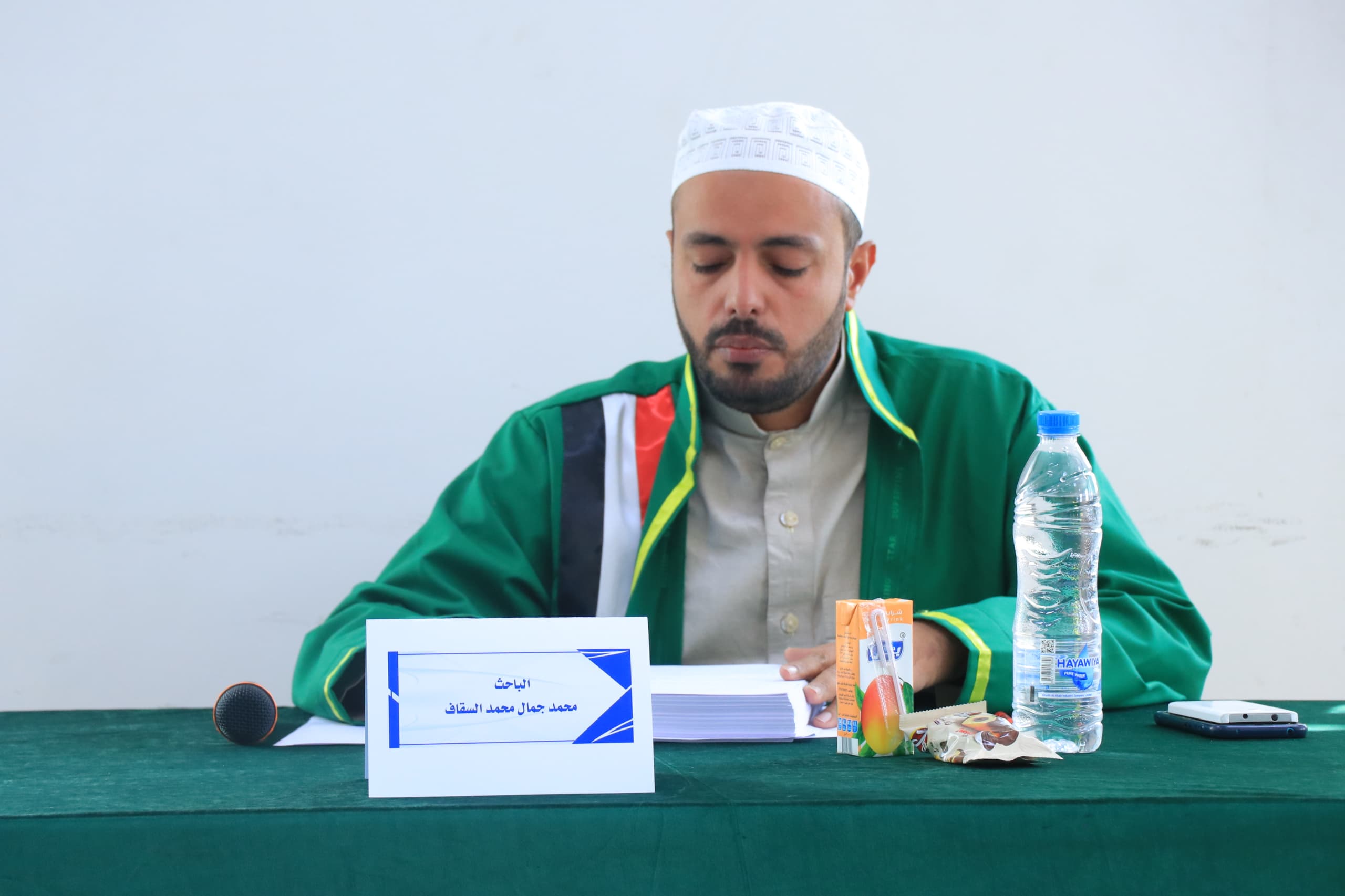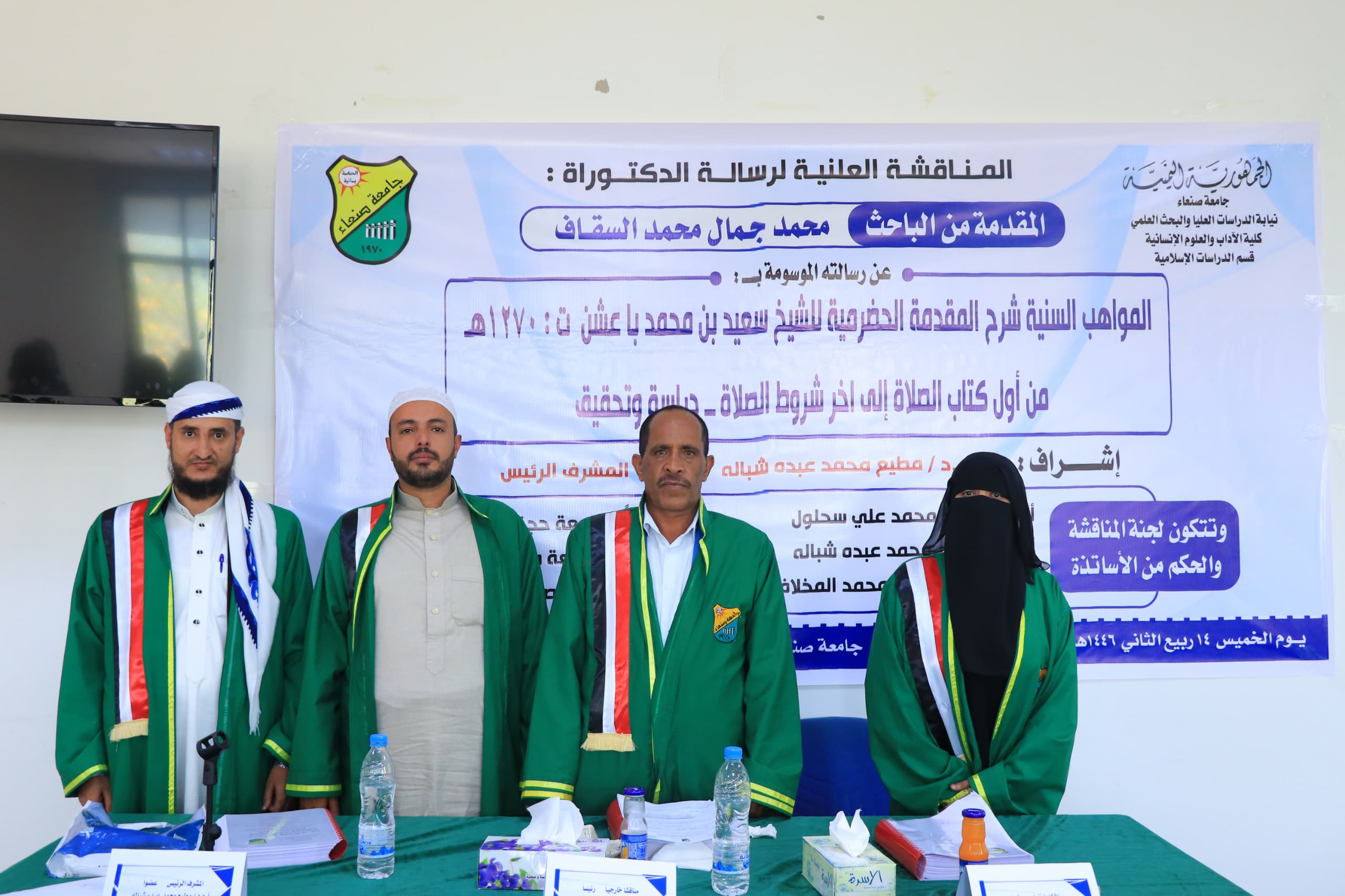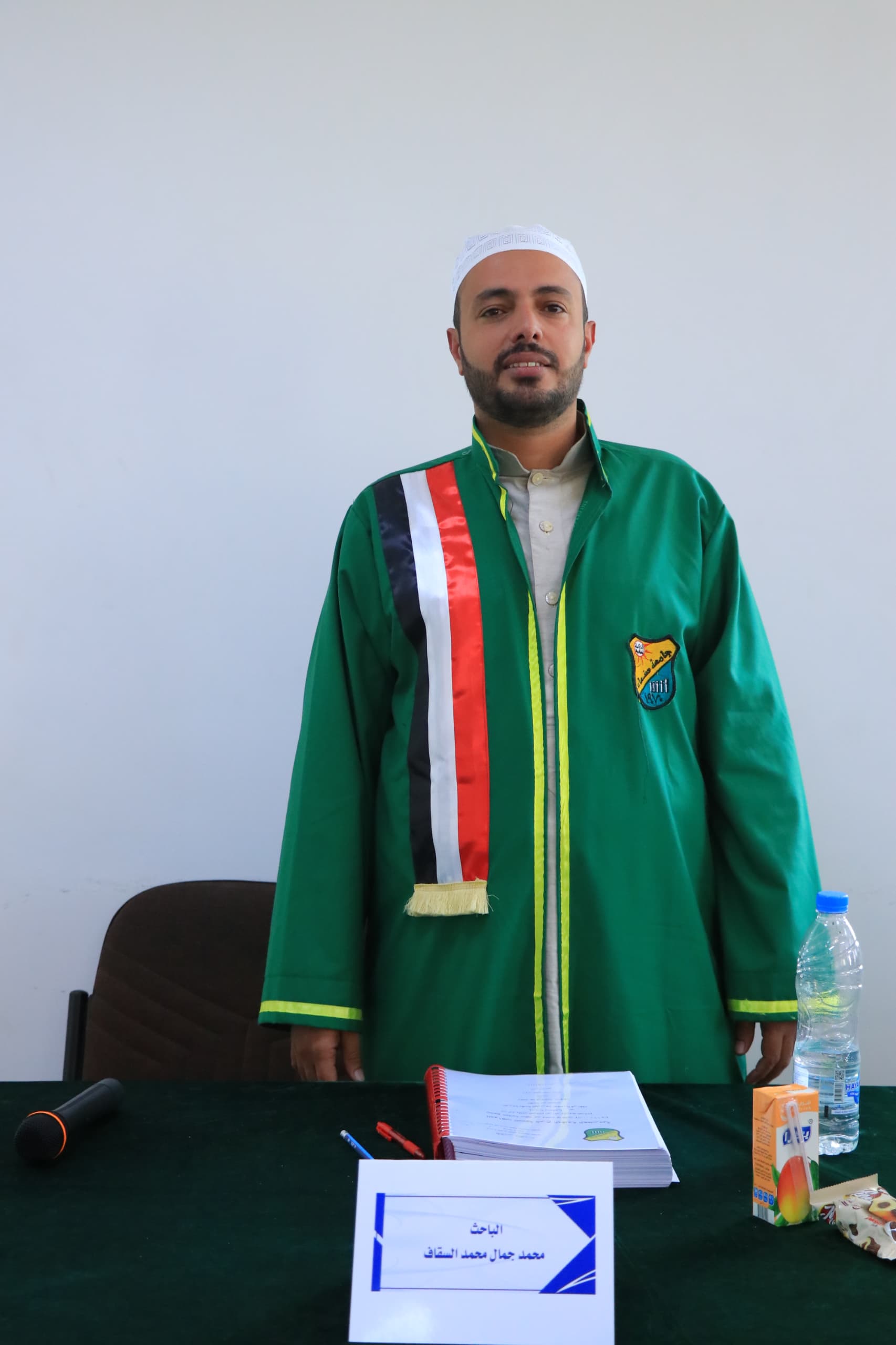 Mr. Mohammad Jamal Mohammad Al-Saqqaf has successfully obtained his PhD degree from the Department of Islamic Studies, Faculty of Arts & Humanities, Sana’a University, majoring in Comparative Jurisprudence. His dissertation, titled “,Al-Ma’wahib Al-Sanniyyah: Explanation of Al-Muqaddimah Al-Hadramiyyah Book By Sheikh Saeed bin Muhammad Baeshen، (Died in 1270 Hijri) from the Beginning of the Book Chapter of Prayer to the end Conditions of Prayer: A Study and Verification” was presented on Thursday, 4/14/1446 Hijri, corresponding to October 17, 2024.