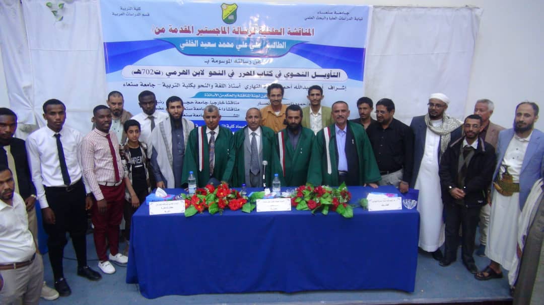 The Public Viva-Voice Examination for the MA Thesis hereto entitled: ” Syntactical Interpretation in Almuharrir Book in Syntax of Ibn Alharami 702H”, submitted by Mr. Ali Ali Mohammed Saeed Alkhalaqi Department of Arabi Language, Faculty of Education –Sana’a, Sana’a University, was held on Saturday, 16/04/1446 Hijri corresponding to 19/10/2024. The Viva-Voce Committee, which was formed based on a resolution issued by the Post-Graduate Studies and Scientific Research Council, consisted of the following: