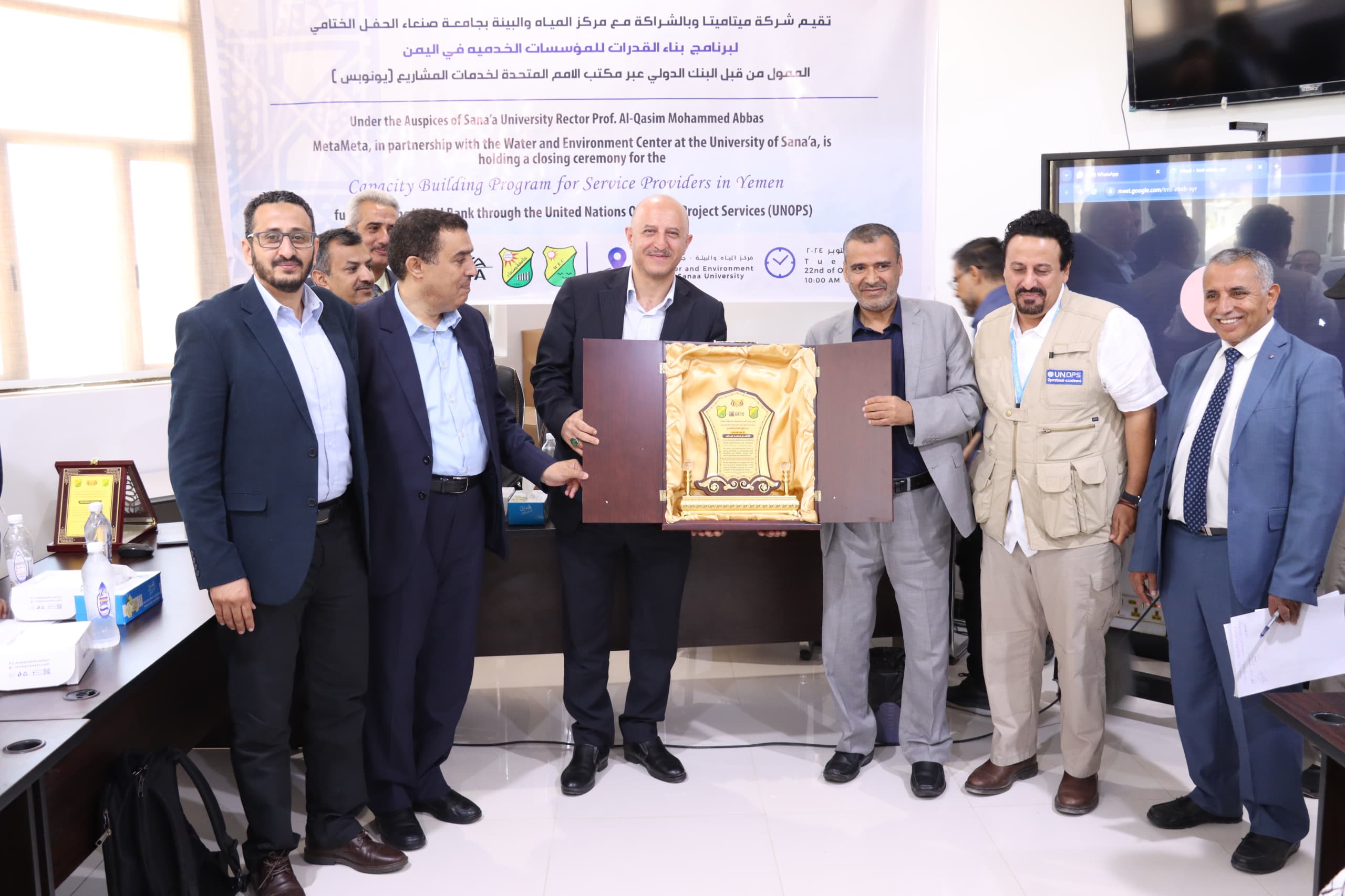 The closing ceremony was concluded with an honoring session for the Water and Environment Center and MetaMeta Company. Certificates of appreciation were awarded to trainers and the program team. Sana’a University received an honorary shield in appreciation of its role in strengthening the capacities of service institutions.