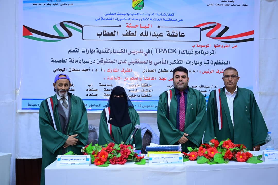 The Public Viva-Voice Examination for the PhD Dissertation hereto entitled: ” The Effect of TPACK Program in Teaching Chemistry for the Development of Self Regulated Learning Skills and Reflective and Future Thinking Skills Among Oustanding Students in Alamana”, submitted by Ms. Aisha Abdullah Lutf Alatab Department of Science (Curricula and Methods of Teaching Science) , Faculty of Education –Sana’a, was held on ……., …/0../1446 Hijri corresponding to …/…/2024. The Viva-Voce Committee, which was formed based on a resolution issued by the Post-Graduate Studies and Scientific Research Council, consisted of the following: