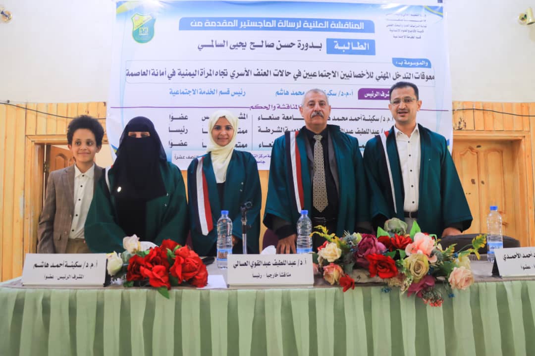 Ms.Badura Hassan Saleh Yahya Al-Salmi, has been awarded her MA degree with distinction, from the Department Social Work, Faculty of Arts & Humanities – Sana’a University, achieving a score of 90%, majoring in Social Work Fields-Family Field. Her thesis, entitled “Obstacles to the Professional Intervention of Social Workers in Cases of Domestic Violence Against Yemeni Women in the Capital,” was successfully defended on Saturday, 28 Jumada Al-Awwal 1446 Hirji, corresponding to November 30, 2024.