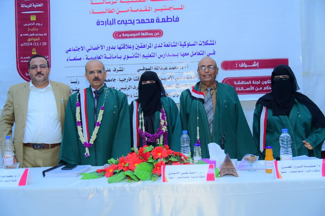 The Public Viva-Voice Examination for the MA Thesis hereto entitled: “Common Behavioral Problems Among Adolescents and Their Relationship to the Role of the Social Specialist in Dealing with Them in Secondary Education Schools in Alamana –Sana’a”, submitted by Ms. Fatma Mohammed Yahya Albareda Department of Educational Psychology (Psychological Guidance), Faculty of Education –Sana’a, Faculty of Education –Sana’a, was held on Thursday, 26/05/1446 Hijri corresponding to 28/11/2024. The Viva-Voce Committee, which was formed based on a resolution issued by the Post-Graduate Studies and Scientific Research Council, consisted of the following:
