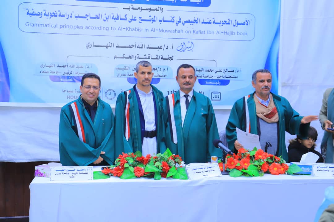 The Public Viva-Voice Examination for the MA Thesis hereto entitled: ” Syntactic The Principles According to Al-Khabisi in the Book Al-Muwashah Ali Kafiya Ibn Al-Hajib: A Descriptive syntactic Study study “, submitted by Mr. Baker Hasan Mohsen Alahnoomy Department of Arabic Language, Faculty of Education –Sana’a, Sana’a University, was held on Sunday, 23/05/1446 Hijri corresponding to 24/11/2024. The Viva-Voce Committee, which was formed based on a resolution issued by the Post-Graduate Studies and Scientific Research Council, consisted of the following: