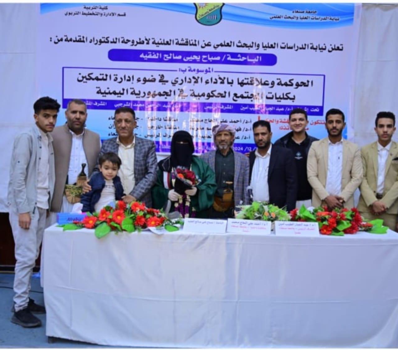 The Public Viva-Voice Examination for the PhD Dissertation hereto entitled: ” Governance and its relationship to administrative performance in light of empowerment management in Yemeni community colleges “, submitted by Ms. Sabah Alfaqih Department of Educational Planning and Adminstration, Faculty of Education –Sana’a, was held on Saturday, 6/06/1446 Hijri corresponding to 7/12/2024. The Viva-Voce Committee, which was formed based on a resolution issued by the Post-Graduate Studies and Scientific Research Council, consisted of the following: