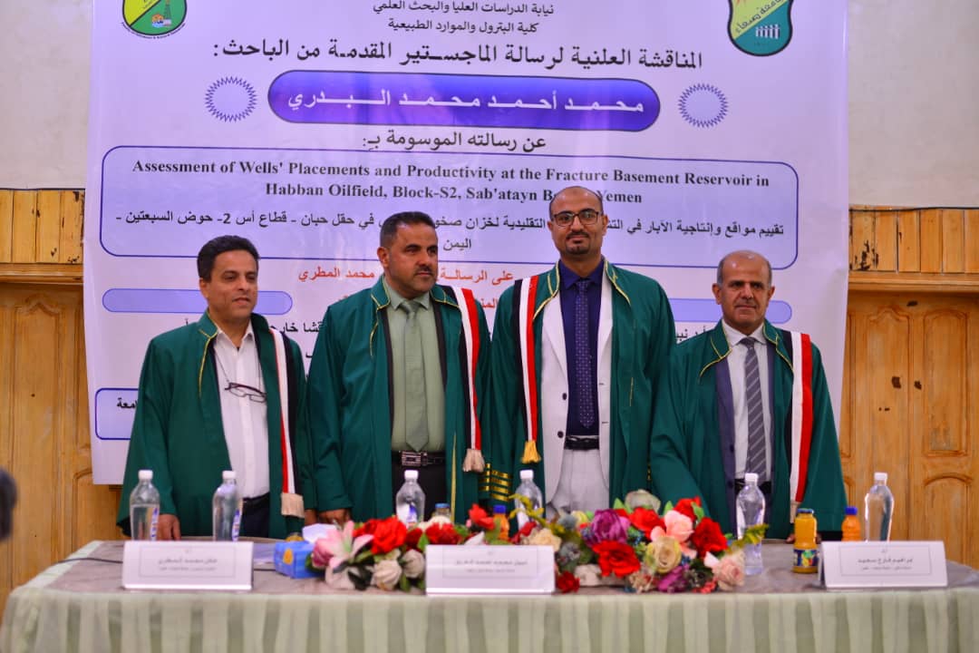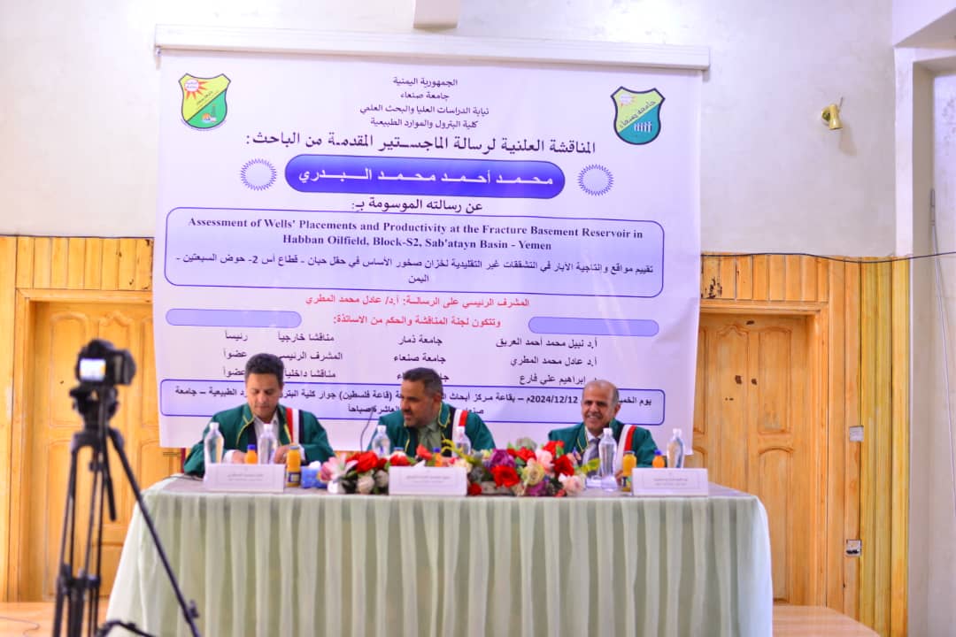 The Public Viva-Voce Examination for the MSc Thesis hereto entitled, ”Assessment of Wells’ Placements and Productivity at the Fracture Basement Reservoir in Habban Oilfield, Block-S2, Sab’atayn Basin – Yemen”, submitted by Mr. Mohammed Ahmed Mohammed Al-Badri, Department of Earth Sciences, Faculty of Petroleum and Natural Resources, was held on Thursday, 10 / 6 /1446 Hijri corresponding to 12/ 12 /2024. The Viva-Voce Committee, which was formed based on a resolution issued by the Post-Graduate Studies and Scientific Research Council, consisted of the following: