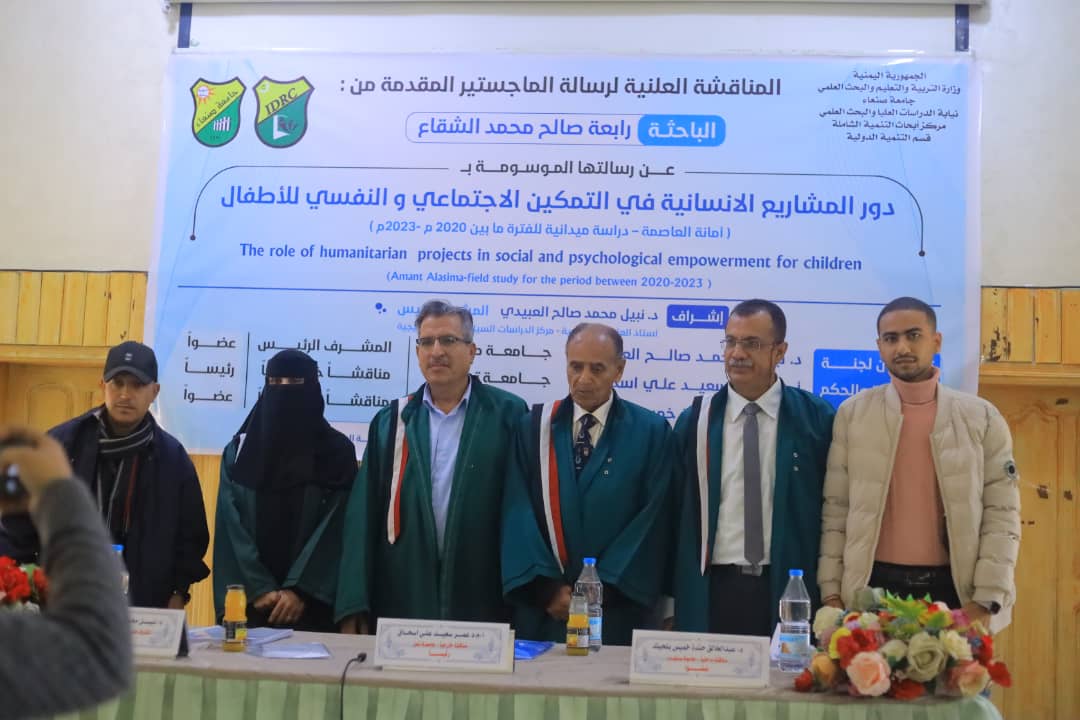 Researcher Rabia Al-Shaqaa has been awarded a Master’s degree with distinction in International Development from the Inclusive Development Research Center at Sana’a University. Her thesis, titled “Humanitarian Projects in the Social and Psychological Empowerment of Children,” explored the impact of humanitarian initiatives on the empowerment of children in Sana’a City between 2020 and 2023. The defense took place on Saturday, December 28, 2024, in the presence of an esteemed examination committee comprising Dr. Omar Saeed Ali Ishaq as the external examiner and committee chair, Dr. Nabil Mohammed Saleh Al-Abidi as the main supervisor and committee member, and Dr. Khaled Handah Khamees Balhiq as the internal examiner and committee member.