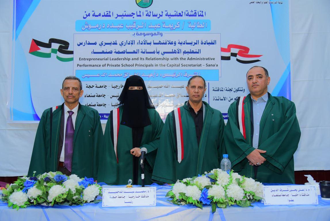 The Public Viva-Voice Examination for the MA Thesis hereto entitled: ” Entrepreneurial Leadership and Its Relationship to the Administrative Performance of the Private School Education Principals in Alamana’, submitted by Ms. Kareema Abdulraqeeb Abdo Darmoush Department of Educational Planning and Administration, Faculty of Education –Sana’a, was held on Thursday, 25/05/1446 Hijri corresponding to 26/12/2024. The Viva-Voce Committee, which was formed based on a resolution issued by the Post-Graduate Studies and Scientific Research Council, consisted of the following: