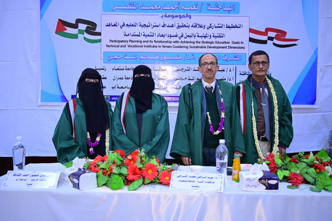 The Public Viva-Voice Examination for the PhD Dissertation hereto entitled: ” Participatory Planning and Its Relationship to Achieving the Aims of the Educational Strategy in Technical and Vocational Institutes in Yemen in the Dimensions of the Sustainable Development”, submitted by Ms. Ne’ama Ahmed Mohammed Almuntaser Department of Educational Planning and Adminstration, Faculty of Education –Sana’a, was held on Wednesday, 01/07/1446 Hijri corresponding to 01/01/2025. The Viva-Voice Committee, which was formed based on a resolution issued by the Post-Graduate Studies and Scientific Research Council, consisted of the following: