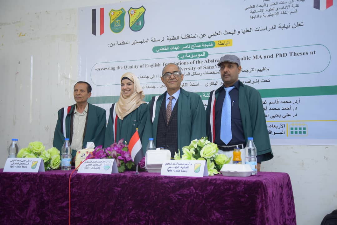 Ms. Khadijah Saleh Nasser Abduallah Al-Fatimi has successfully awarded her MA degree with a commendable score of 93, achieving an excellent grade from the Department of English Language and Literature, majoring in Translation Studies, within the Faculty of Arts & Humanities at Sana’a University. Her thesis, titled “Assessing the Quality of English Translations of the Abstracts of Arabic MA and PhD Theses at the University of Sana’a,” was defended on Wednesday, 8 Rajab 1446 Hijri, corresponding to January 8, 2025. The thesis is conducted under the supervision of Dr. Ahmed Mohammed Ahmed Al-Bakri, Main Supervisor, Assistant Professor of Linguistics, Faculty of Arts & Humanities, Sana’a University.
