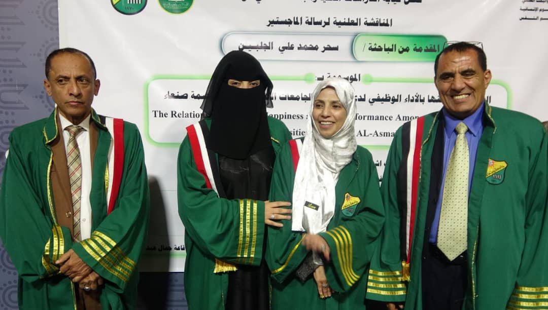 Ms. Sahar Mohammad Ali Al-Jalbin has successfully awarded her MA Psychology, majoring in Positive Psychology, from the Faculty of Arts & Humanities at Sana’a University. She achieved an outstanding academic performance, earning a percentage of 95% for her thesis entitled “The Relationship Between Happiness and Job Performance Among Female Employees of Private Universities in Amanat AL-Asmah – Sana’a.” The thesis defense took place on Thursday, Rajab 9, 1446Hijri, corresponding to January 9, 2025.