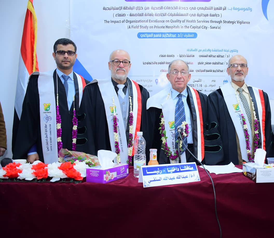 The Public Viva-Voce Examination for the PhD Dissertation hereto entitled, The Impact of Organizational Excellence on Quality of Health Services through Strategic Vigilance: A Field Study on Private Hospitals in the Capital City – Sana’a, submitted by Mr. Abdulrahman Naji Hassan Al-Samawi, to the Center of Business Administration, was held on Monday, 06/07/1446 Hijri corresponding to 06/01/2025. The Viva-Voce Committee, which was formed based on a resolution issued by the Post-Graduate Studies and Scientific Research Council, consisted of the following: