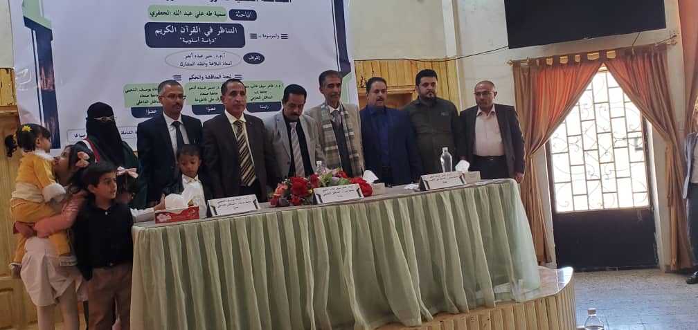 The Public Viva-Voce Examination for the PhD Dissertation hereto entitled, Symmetry in the Holy Quran “Stylistic study”, submitted by Ms. Sumaya Taha Ali Abdullah Aljafari, Department of Arabic, Faculty of Languages, was held on Saturday, 16/07/1446 Hijri corresponding to 16/01/2025. The Viva-Voce Committee, which was formed based on a resolution issued by the Post-Graduate Studies and Scientific Research Council, consisted of the following: