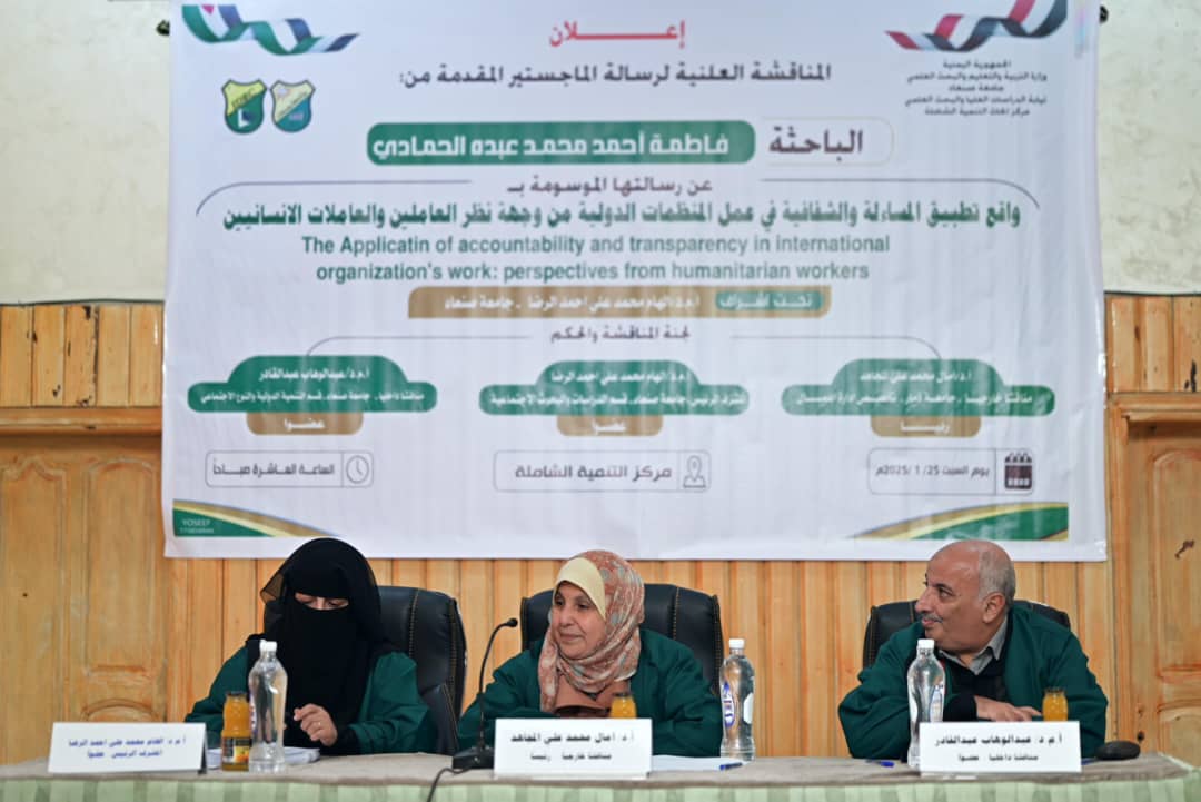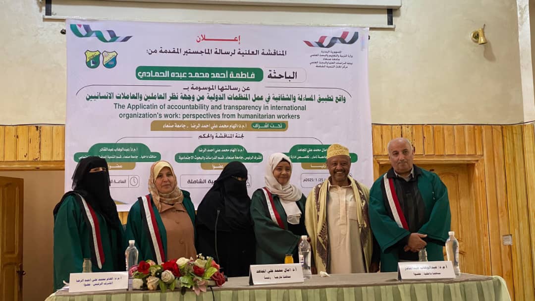 Researcher Fatima Ahmed Mohammed Al-Hammmadi has been awarded a master’s degree with distinction in International Development and Gender Studies from the Inclusive Development Research Center (IDRC) at the University of Sana’a. Her thesis, titled “The Application of Accountability and transparency in International Organization’s work: Perspectives from Humanitarian Workers,” was defended on Saturday, January 25, 2025.