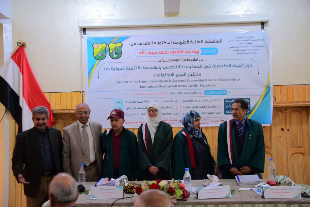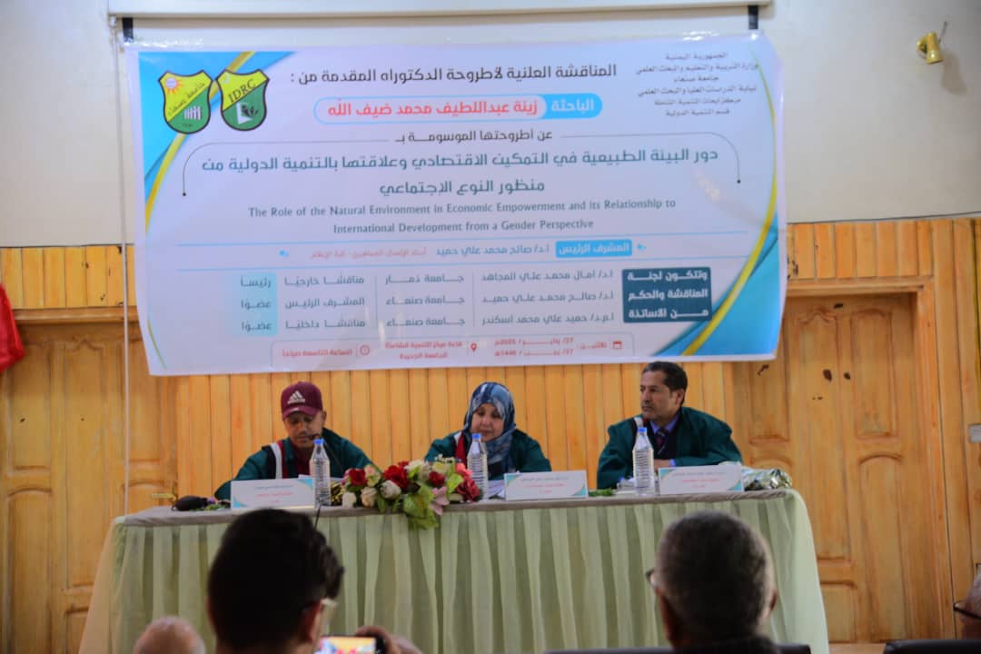 Researcher Zaina Abdullatif Mohammed Dhaifallah has been awarded a PhD in International Development and Gender Studies from the Inclusive Development Research Center (IDRC) at Sana’a University. On Monday, January 27, 2025, she successfully defended her dissertation titled ” The Role of the Natural Environment in Economic Empowerment and its Relationship to International Development from a Gender Perspective.”