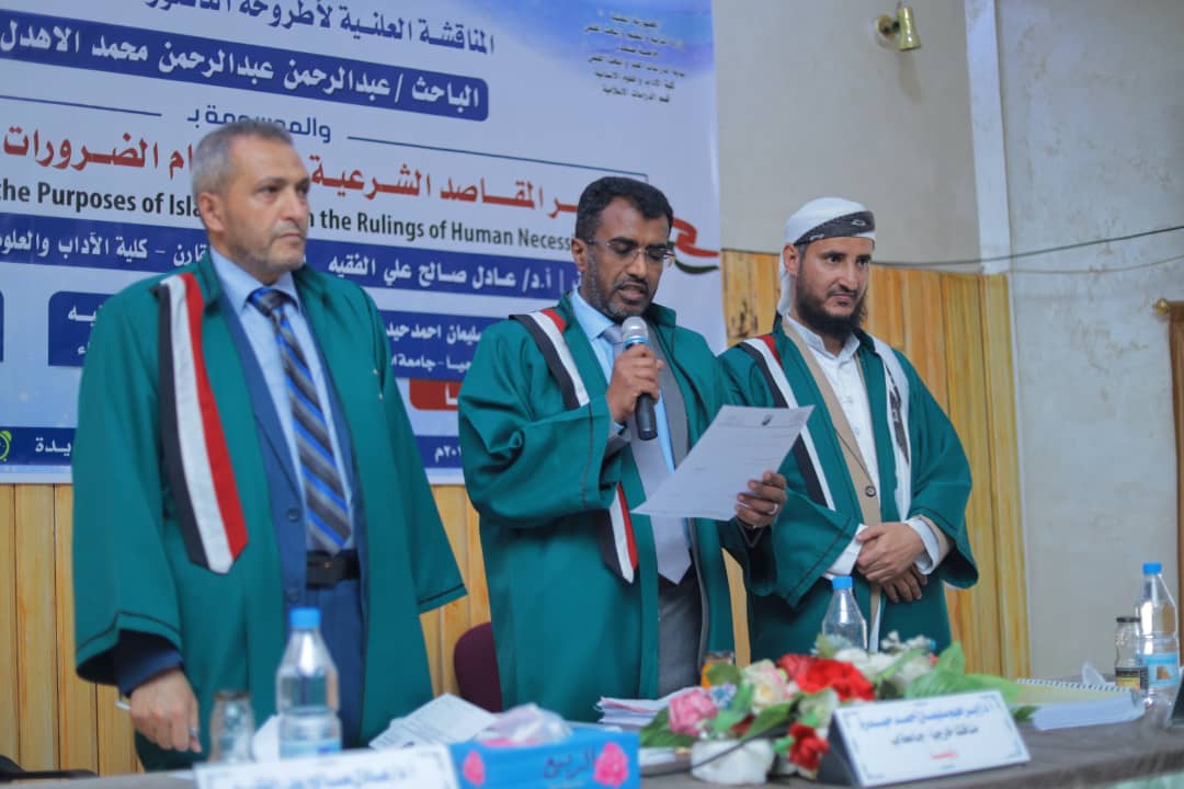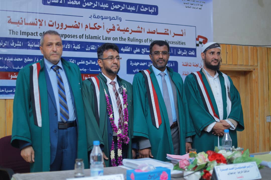 Mr. Abdulrahman Abdulrahman Mohammad Al-Ahdal has successfully awarded the PhD degree from the Department of Islamic Studies, Faculty of Arts & Humanities at Sana’a University, majoring in Principles of Jurisprudence. His dissertation, entitled “The Impact of the Purposes of Islamic Law on the Rulings of Human Necessities,” was defended on Wednesday, the 29th of Rajab, 1446 Hijri, corresponding to January 29, 2025.