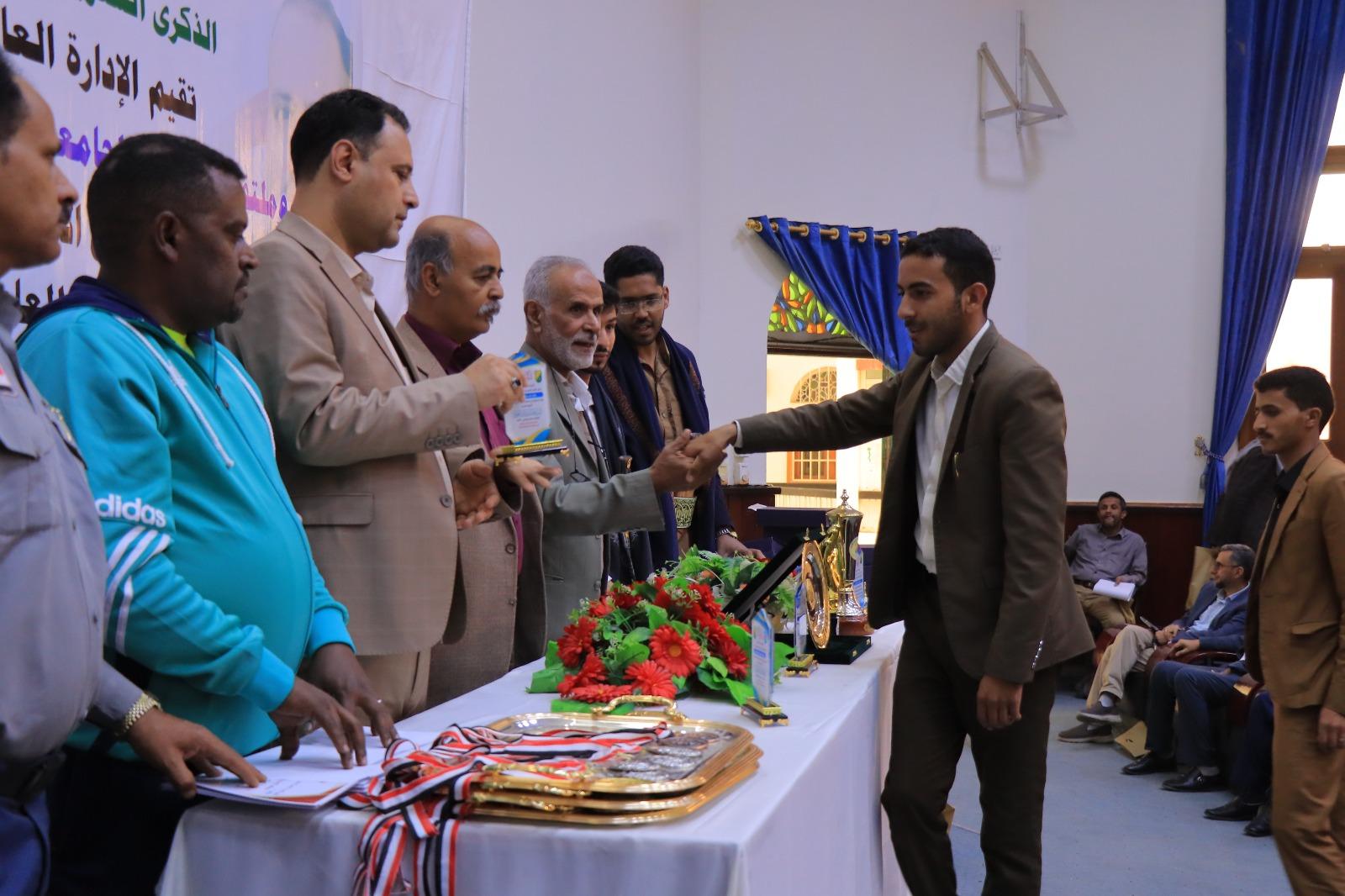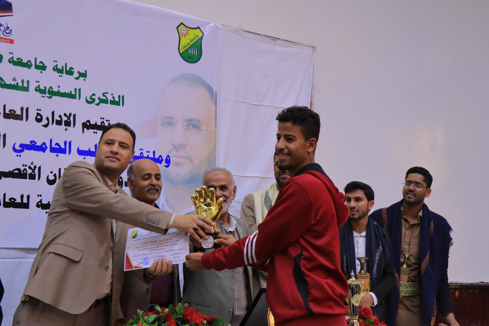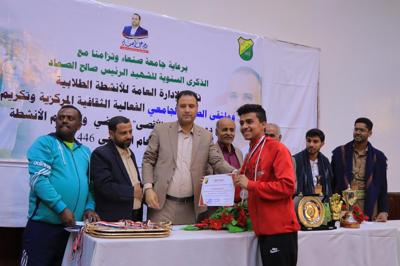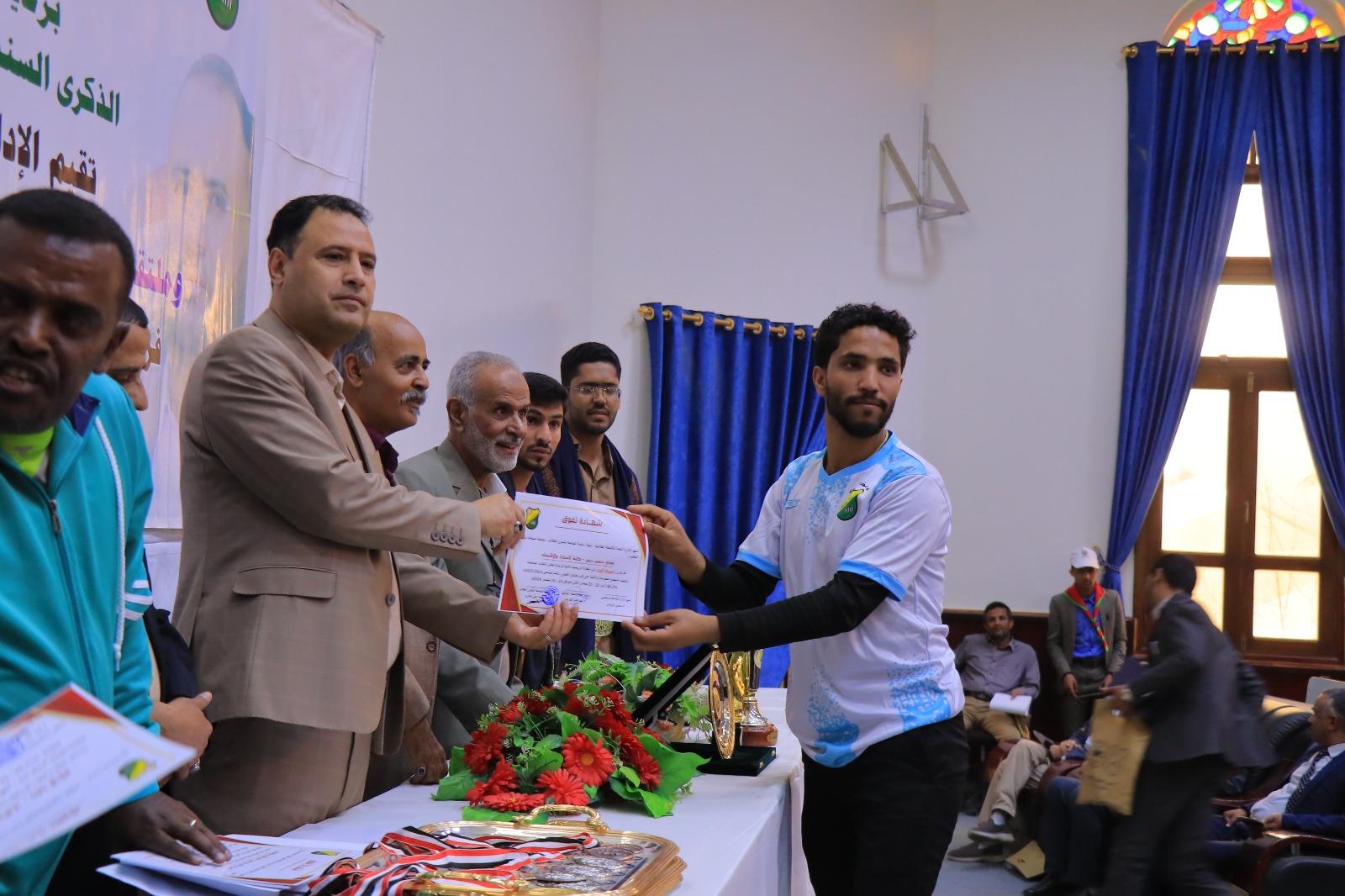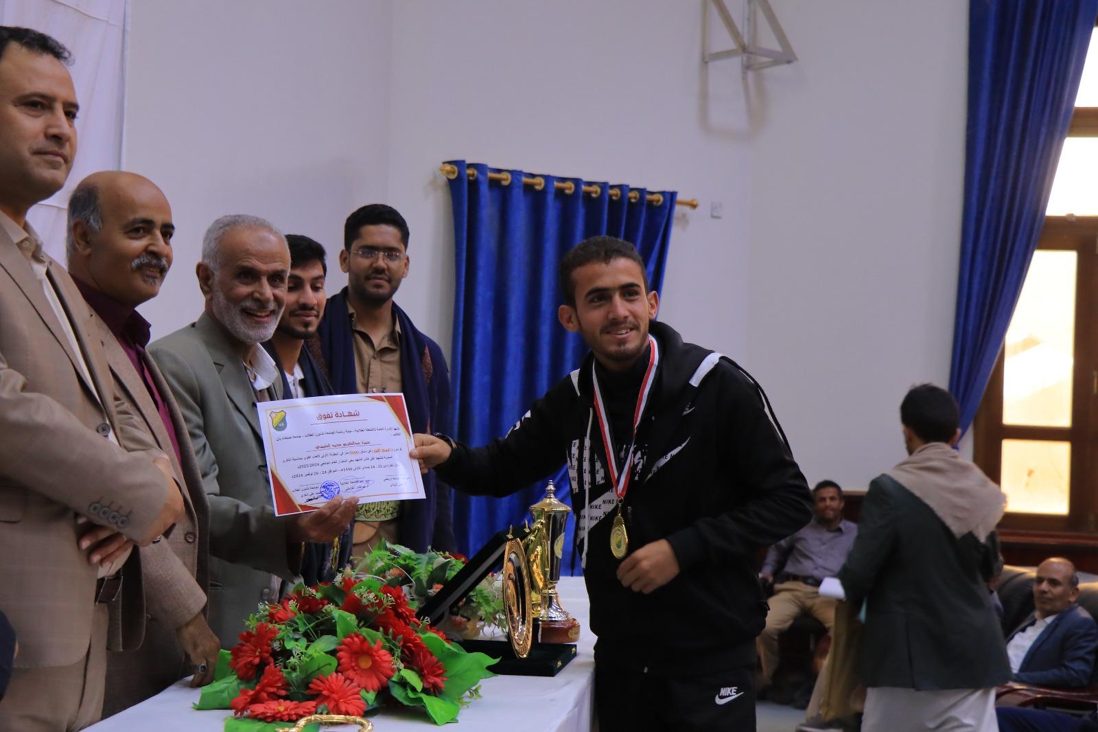 The ceremony also celebrated Sana’a University representatives who excelled in the Yemeni Universities Championships for the academic year 1445 AH (2024-2025). Honorees included Sami Al-Ziyadi, Supervisor of the University Teams, Dr. Issam Al-Marwa’i, Athletics Team Coach, and Ali Sudais, Athletics Team Administrator. In addition, top-ranked athletes were honored for their achievements, including Saddam Wais, who scored first place in the university badminton championship; Basheer Al-Mahaqiri who secured second place in the university table tennis championship; Ahmed Ja’man who achieved third place in the university badminton championship; Hamzah Al-Dhaifi, first place in the 1500-meter race, Fakhr Al-Din Muqbil, second place in the 800-meter race, Naif Al-Dhaifi, second place in the 200-meter race, Abdulaziz Al-Maswari; second place in javelin throw; Abdullah Al-Ahdal, second place in the long jump; Basim Hadian, third place in the 1500-meter race; Fakhr Al-Din Muqbil, third place in the 400-meter race; Hamzah Surur, third place in the long jump; Abdulaziz Al-Maswarri, second place in shot-putting, and Amjad Ziyad (Faculty of Commerce) with the title of the Best Goalkeeper in the Yemeni Universities Championship.