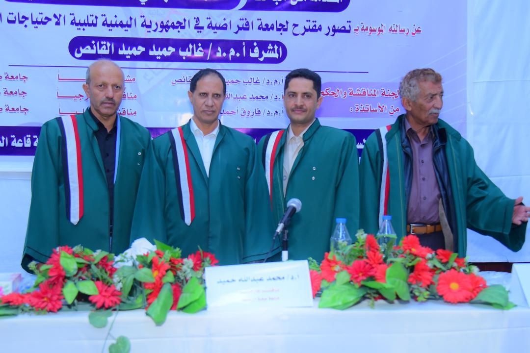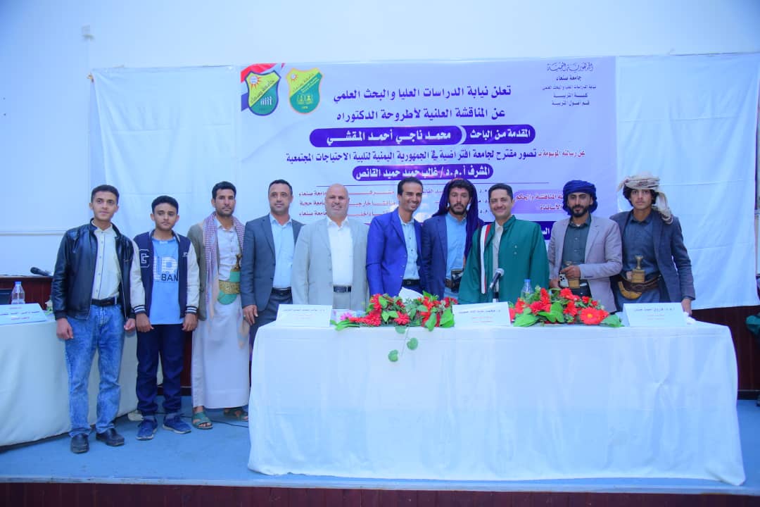 The Public Viva-Voice Examination for the PhD Dissertation here to entitled: “A suggested Vision for a Virtual University in Yemen Republic to meet the societal needs”, submitted by Mr. Mohammed Naji Ahmed Amuqashi Department of Foundations of Education, Faculty of Education –Sana’a, Sana’a University, was held on Saturday, 02/08/1446 Hijri corresponding to 01/02/2025. The Viva-Voice Committee, which was formed based on a resolution issued by the Post-Graduate Studies and Scientific Research Council, consisted of the following: