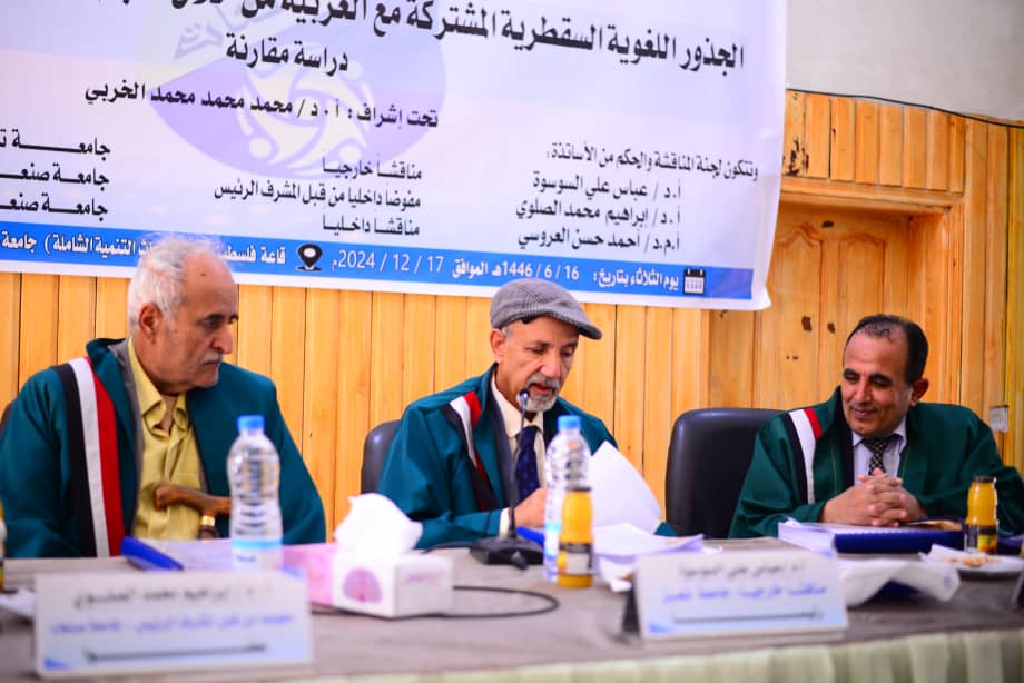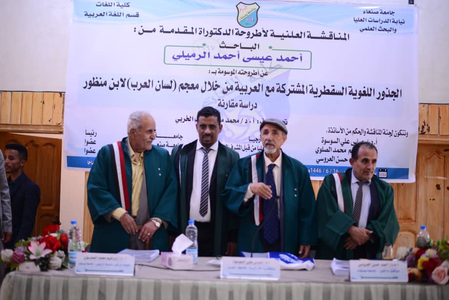 The Public Viva-Voce Examination for the PhD Dissertation hereto entitled Common Socotri Linguistic Roots with Arabic in Ibn Manzur’s Dictionary (Lisanal-Arab) A Comparative Study.”, submitted by Mr. Ahmad Issa Ahmad Al-Rumayli, Department of Arabic Language, Faculty of Languages, was held on Tuesday, 16/06/1446 Hijri corresponding to 17/12/2024. The Viva-Voce Committee, which was formed based on a resolution issued by the Post-Graduate Studies and Scientific Research Council, consisted of the following: