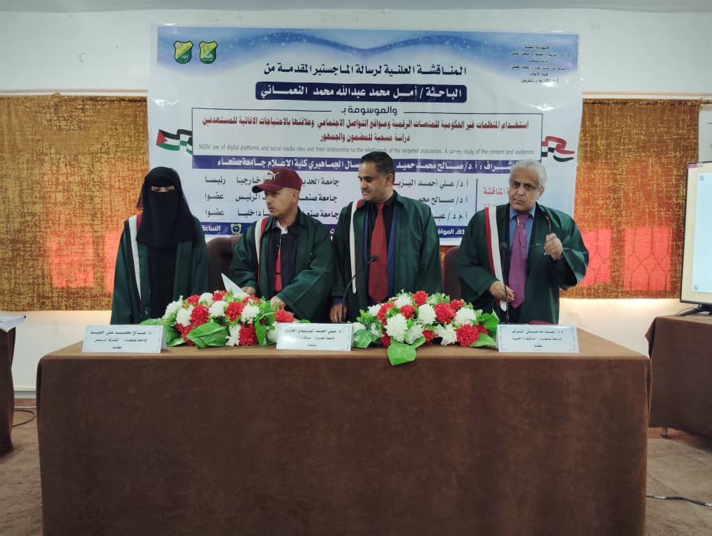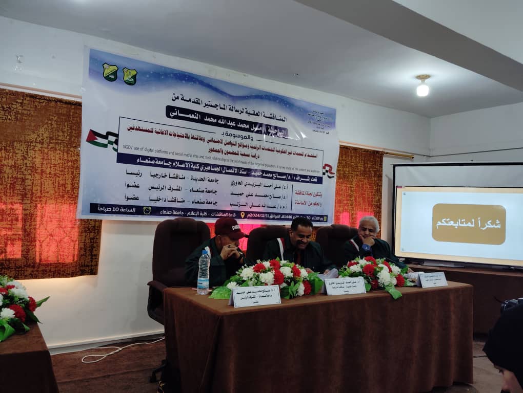 Her thesis, titled “The Use of Non-Governmental Organizations of Digital Platforms and Social Media Sites and their Relationship to the Relief Needs of the Targeted Groups”, was discussed on 30 Jumada Al-Akhira 1446 AH, corresponding to December 31, 2024.
