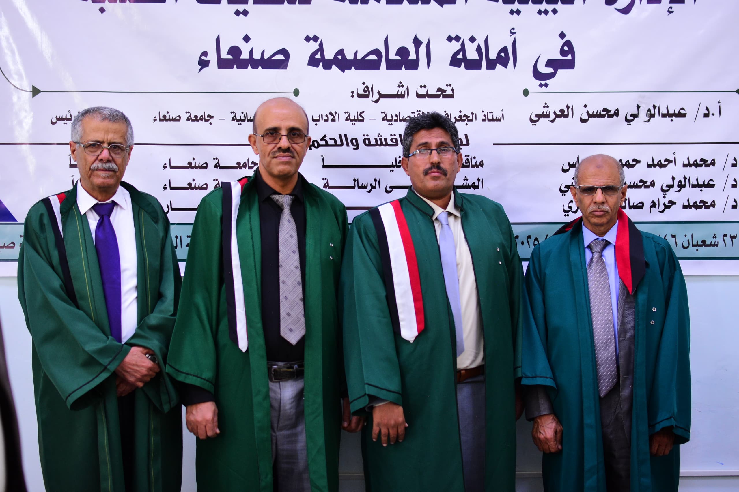 Mr. Khaled Hussein Abdullah Tahash has been awarded the PhD Degree from the Department of Geography and Geoinformatics, Faculty of Arts & Humanities – Sana’a University, majoring in Environmental Geography. His dissertation, entitled “Integrated Environmental Management of Solid Waste in the Capital City of Sana’a,” was defended on Saturday, 23 Sha’aban 1446 Hijri, corresponding to February 22, 2025.