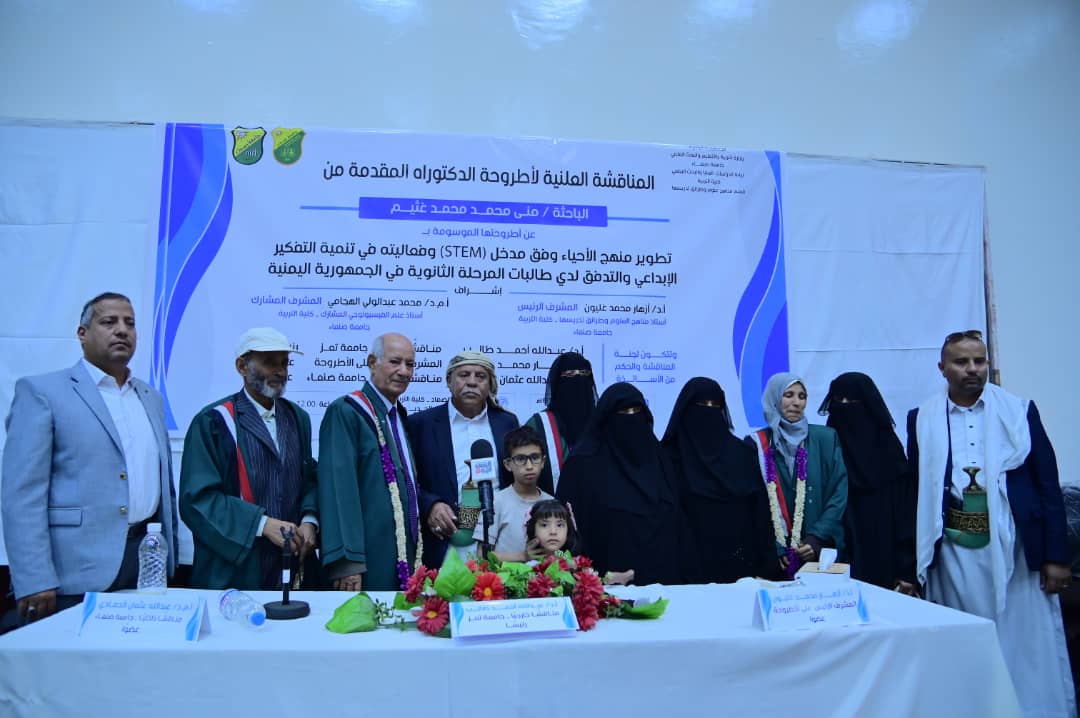 The Public Viva-Voice Examination for the PhD Dissertation hereto entitled: ” Developing the Biology Curriculum According to the STEM Approach and Its Effectiveness on the Development of Creative Thinking and Flow Among Female Secondary School Students in Yemen Republic”, submitted by Ms. Muna Mohammed Mohammed Ghuthaim Department of Science (Curricula and Methods of Teaching Science), Faculty of Education –Sana’a, was held on Thursday, 21/08/1446 Hijri corresponding to 20/02/2025. The Viva-Voice Committee, which was formed based on a resolution issued by the Post-Graduate Studies and Scientific Research Council, consisted of the following: