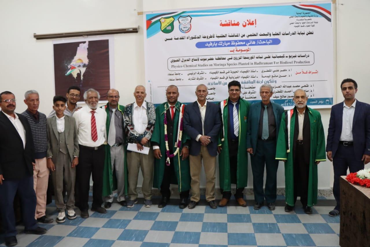 The Public Viva-Voce Examination for the MSc Dissertation entitled, “Physico-Chemical Studies on Moringa Species Planted in Hadramout Governorate for Biodiesel Production”, submitted by Mr. Hani Mahfouz Mubarak , Department of Chemistry, Faculty of Sciences, was held on Saturday 22/02/1446 Hijri corresponding to 23/08/2024. The Viva-Voce Committee, which was formed based on a resolution issued by the Post-Graduate Studies and Scientific Research Council, consisted of the following: