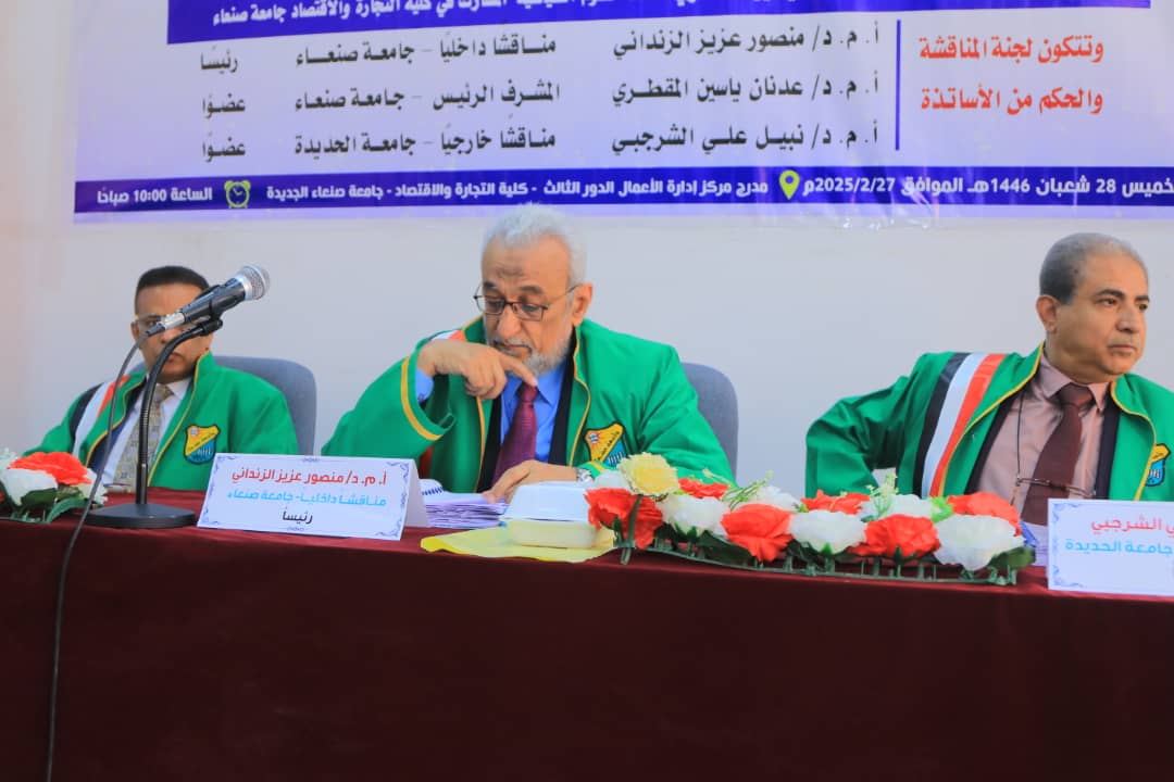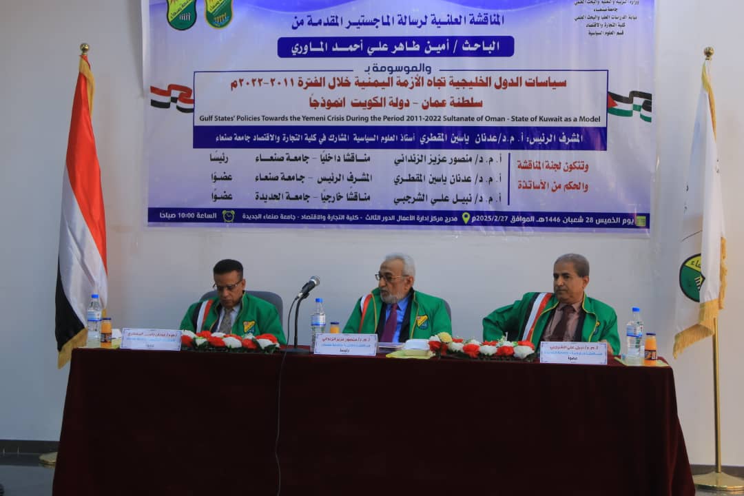 Researcher Amin Taher Al-Mawri obtained a master’s degree with an overall grade of (Excellent) and a percentage of 92% in the Department of Political Science, specializing in International Relations, Faculty of Commerce and Economics, Sana’a University, for his thesis entitled) The policies of the Gulf countries towards the Yemeni crisis during the period 2011-2022 AD, the Sultanate of Oman and the State of Kuwait as a model) on Thursday 8/29/51446 corresponding to 2/27/2025 AD. The discussion and judgment committee consisted of: Professor Dr. Adnan Yassin Al-Maqtari, head supervisor and member of the committee, Professor Dr. Mansour Aziz Al-Zindani, internal examiner and head of the committee, and Professor Dr. Nabil Ali Al-Sharjabi, external examiner and member of the committee.