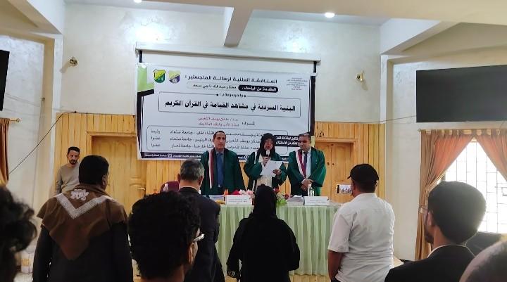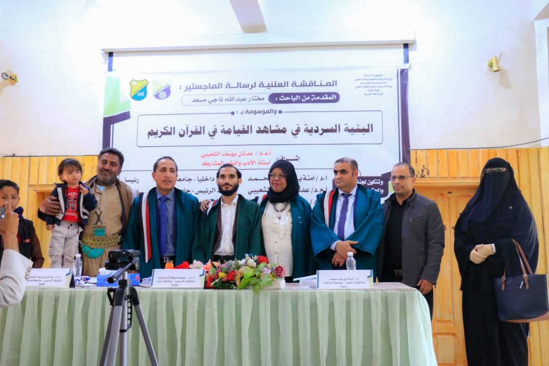 The Public Viva-Voce Examination for the MA Thesis hereto entitled, The Narrative Structure In the Scenes of the Resurrection in the Holy Quran, submitted by Mr. Mukhtar Abdullah Naji Mosed, Department of Arabic, Faculty of Languages, was held on Saturday, 09/08/1446 Hijri corresponding to 08/02/2025. The Viva-Voce Committee, which was formed based on a resolution issued by the Post-Graduate Studies and Scientific Research Council, consisted of the following: