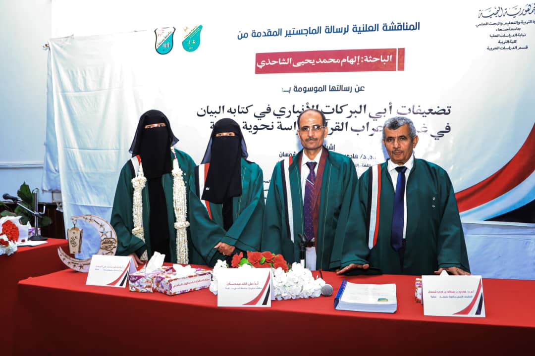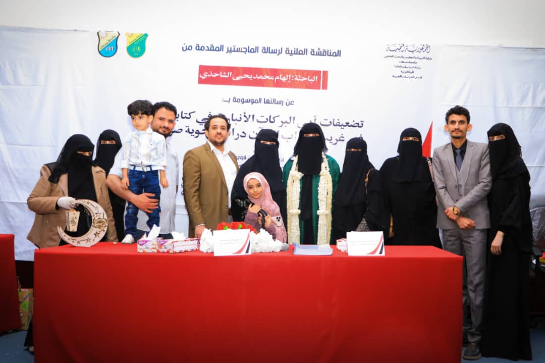 Researcher Ilham Mohammed Yahya Al-Shahethi was awarded a Master’s degree with an overall excellent grade and a score of 93% from the Department of Arabic Studies, at the Faculty of Education, Sana’a University.