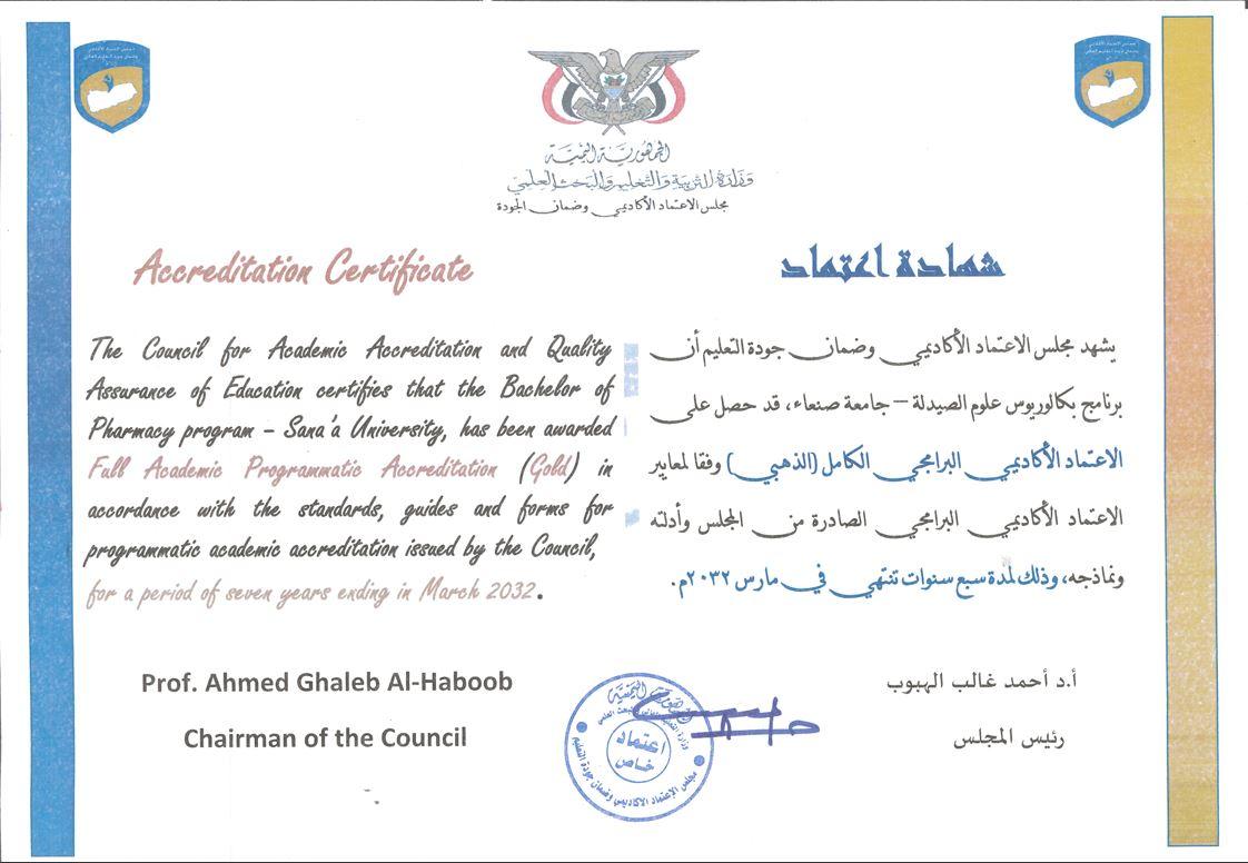 Programmatic Academic Accreditation Certificate (Gold Level) for the Bachelor of Pharmaceutical Sciences program according to the programmatic accreditation standards set by the CAQA.