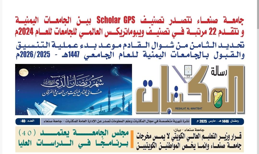 The General Administration of Libraries at Sana’a University has released the latest edition of its monthly specialized newspaper, Risalat Al-Maktabat (Library Message), for March 2025.