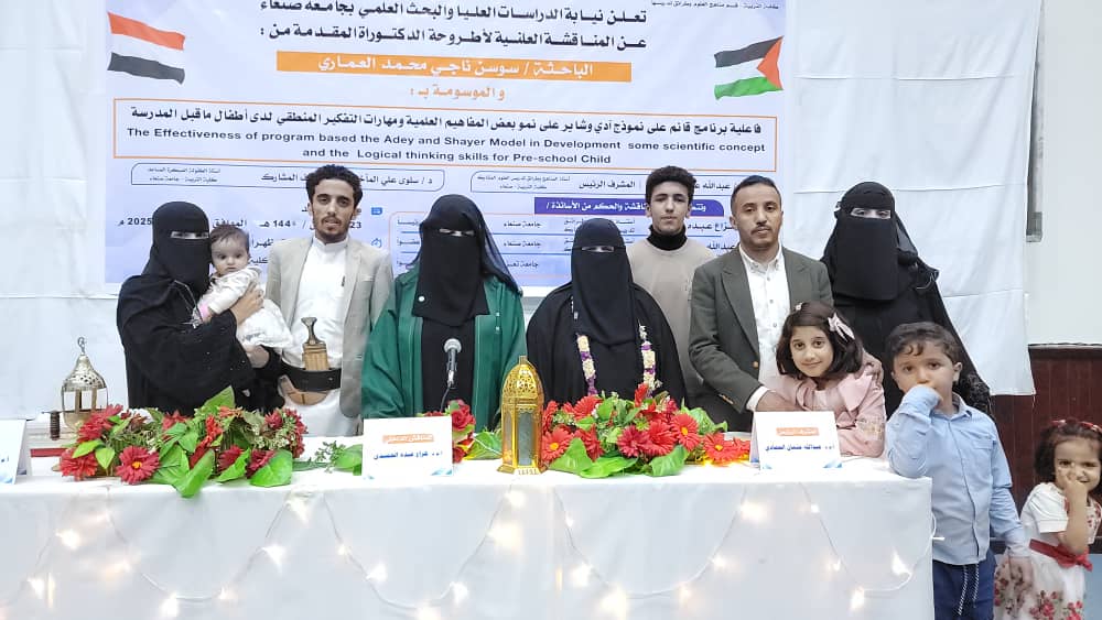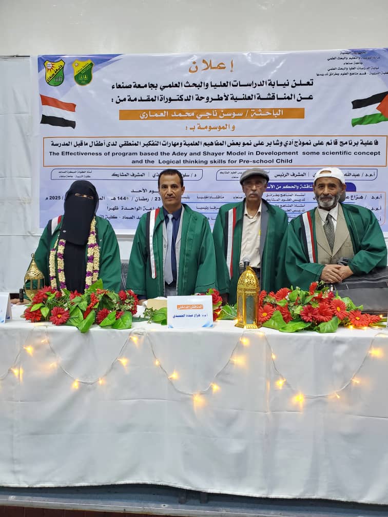 The Public Viva-Voice Examination for the PhD Dissertation hereto entitled: ” The Effectiveness of a Program Based on Addy and Shair Model on the Development of Some Scientific Concepts and Logical Thinking Skills Among Preschool Children”, submitted by Miss. Sawsan Naji Mohammed Alammari Department of Science (Curricula and Methods of Teaching Science) , Faculty of Education –Sana’a, was held on Sunday, 23/09/1446 Hijri corresponding to 23/03/2025. The Viva-Voice Committee, which was formed based on a resolution issued by the Post-Graduate Studies and Scientific Research Council, consisted of the following: