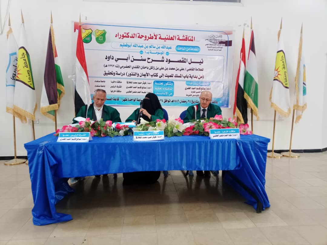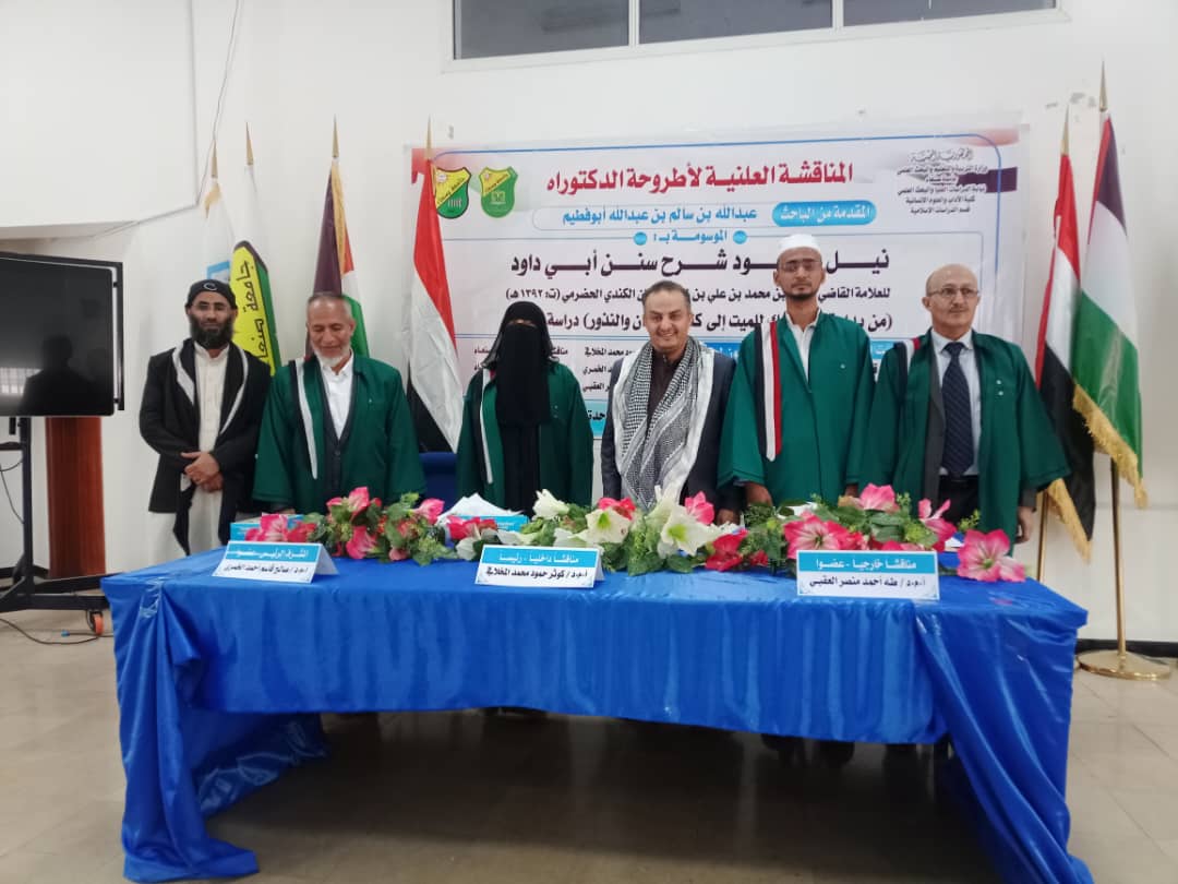 Mr. Abdullah bin Salem bin Abdullah Abu Fataim has been awarded the PhD Degree majoring in Hadith and Sciences, from the Department of Islamic Studies, Faculty of Arts & Humanities – Sana’a University. His dissertation, entitled “Nail Al-Maqsoud: The Explanation of Sunan Abu Dawood by Ali bin Mohammed bin Ali bin Zakin Bahannan Al-Kindi Al-Hadhrami (Died in 1392 Hijri), from the Beginning of the Chapter on Musk for the Dead to the Chapter of Oaths and Vows: A Study and Verification,” was defended on Monday, Ramadan 24, 1446 Hijri corresponding to March 24, 2025.