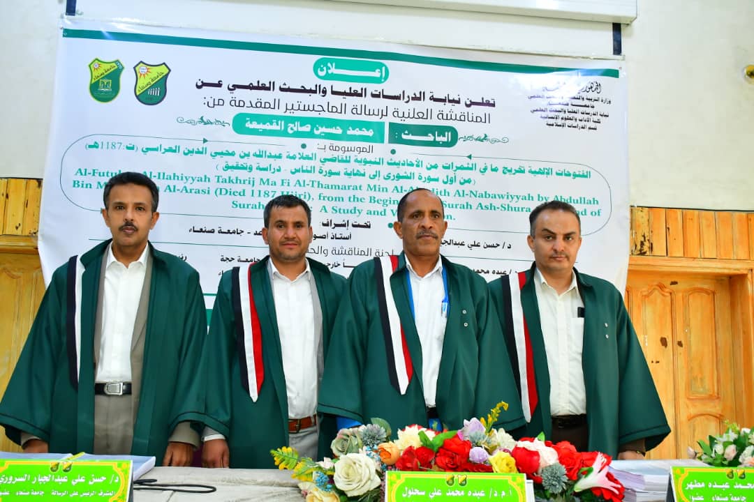 Mr. Mohammed Hussein Saleh Al-Qami’a has been awarded the MA Degree with distinction achieving a commendable grade of 94%, from the Department of Islamic Studies, majoring in Hadith and Sciences, at the Faculty of Arts & Humanities, Sana’a University. His thesis, titled “Al-Futuhat Al-Ilahiyyah Takhrij Ma Fi Al-Thamarat Min Al-Ahadith Al-Nabawiyyah by Abdullah Bin Muhyiddin Al-Arasi (Died 1187 Hijri), from the Beginning of Surah Ash-Shura to the End of Surah An-Nas: A Study and Verification,” was successfully defended on Wednesday Ramadan 19, 1446 Hijri corresponding to March 19, 2025.