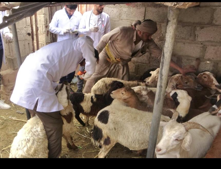The first veterinary medical camp for treating livestock was inaugurated today in Bani Al-Harith Directorate. The camp is organized by the Faculty of Veterinary Medicine, Sana’a University, under the generous patronage of Sana’a University, the Supreme Agricultural and Fisheries Committee, the local authority, and Bani Al-Harith Multi-Purpose Cooperative Agricultural Association.